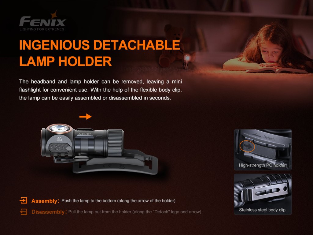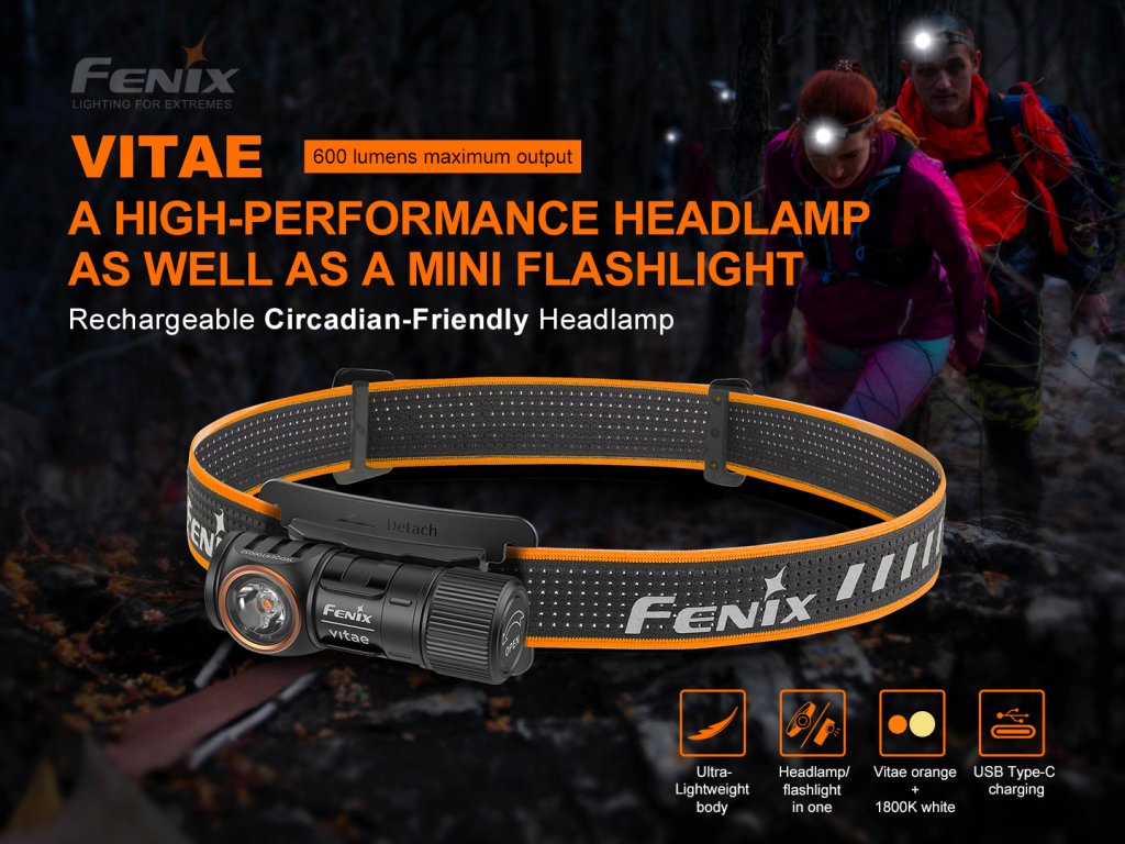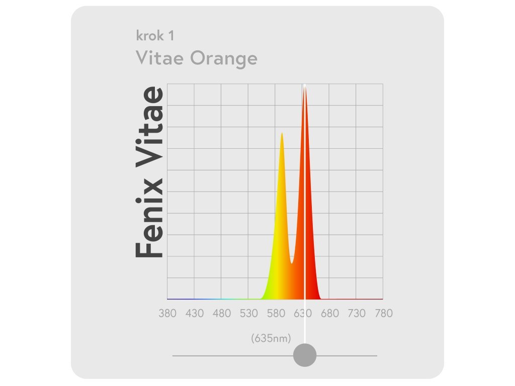 - Tri režimy oranžovo-červeného Vitae svetla: 5 lúmenov (30,5 hodiny) -> 1 lúmen (60 hodín) -> blikanie 5 lúmenov (60 hodín).