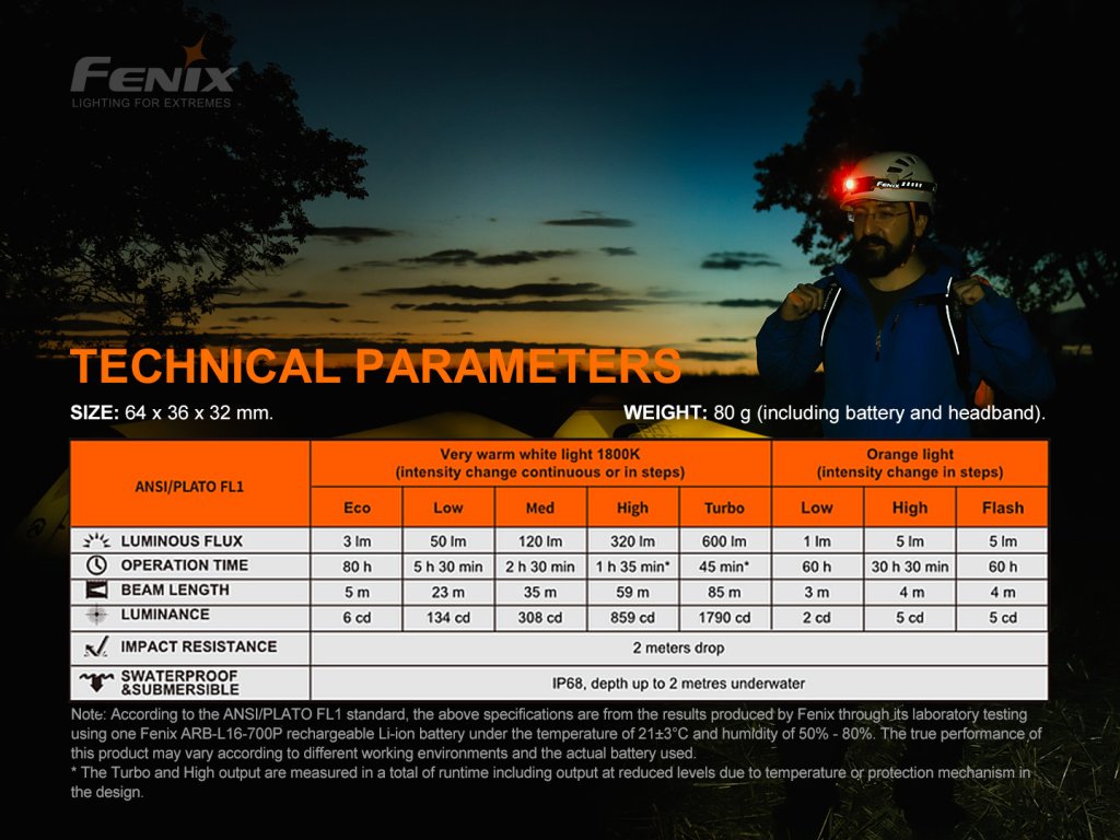- Na napájanie používa jeden Li-ion akumulátor Fenix RCR123A 700 mAh, ktorý je súčasťou balenia.