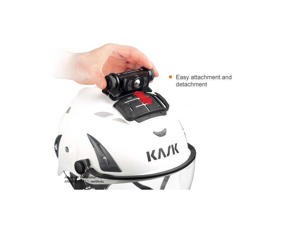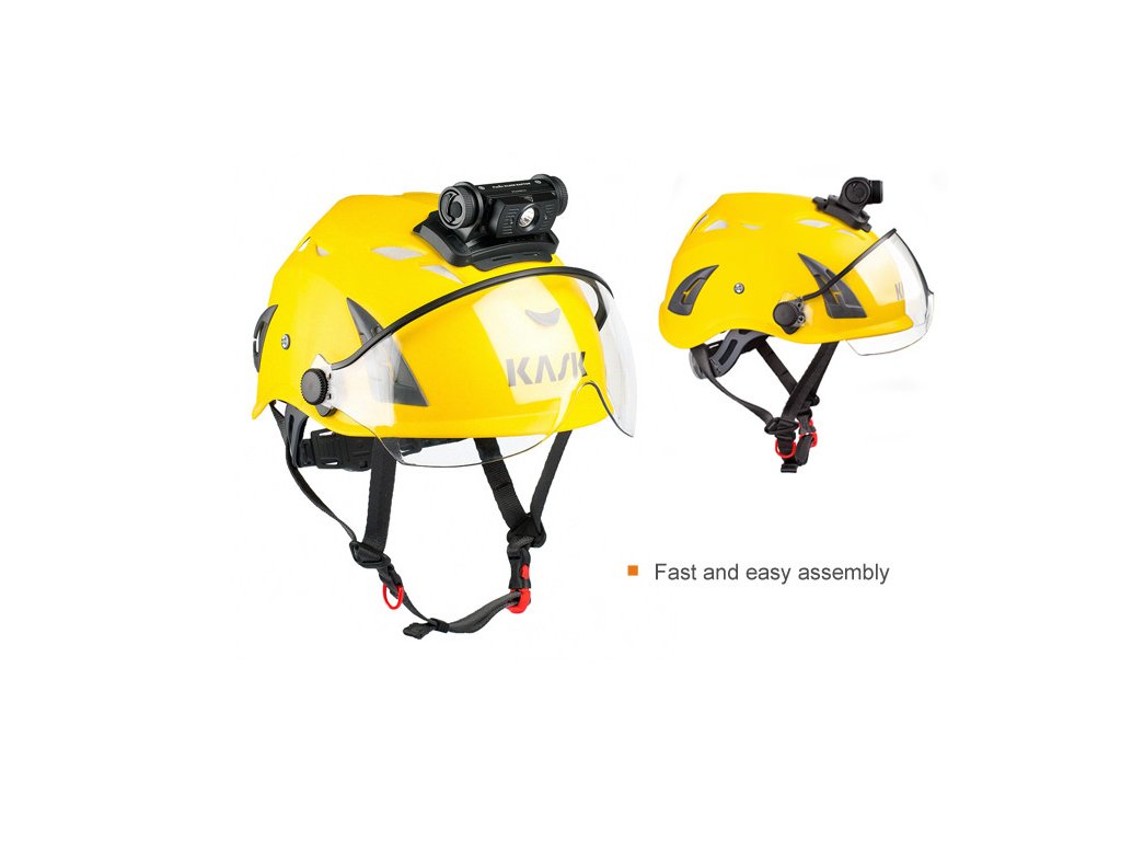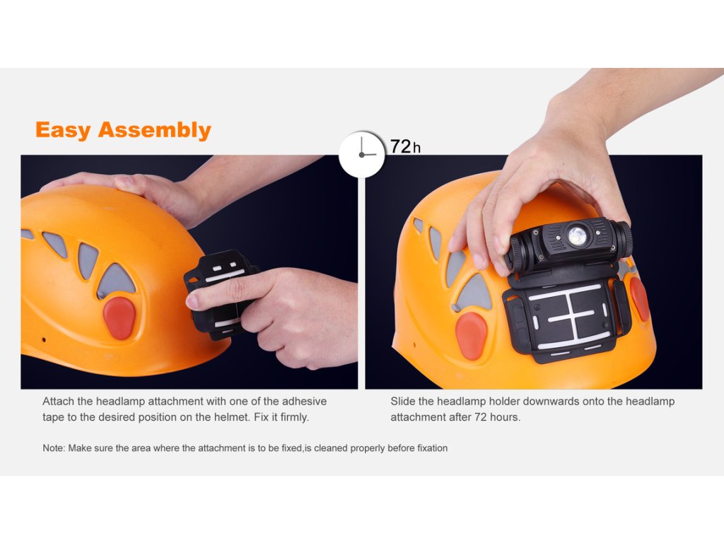Prilepte montáž na prilbu, pomocou jednej z obustranných pások a nechajte lepidlo pôsobiť 72 hodín. Čelovku možno do držiaku upevniť jednoduchým zasunutím. Na helme vyberte miesto, ktoré bude tvarom najlepšie kopírovať tvar držiaka a čelovka pôjde nastaviť do požadovaného smeru svietenia. Plocha na helme musí byť pred nalepením čistá a suchá.