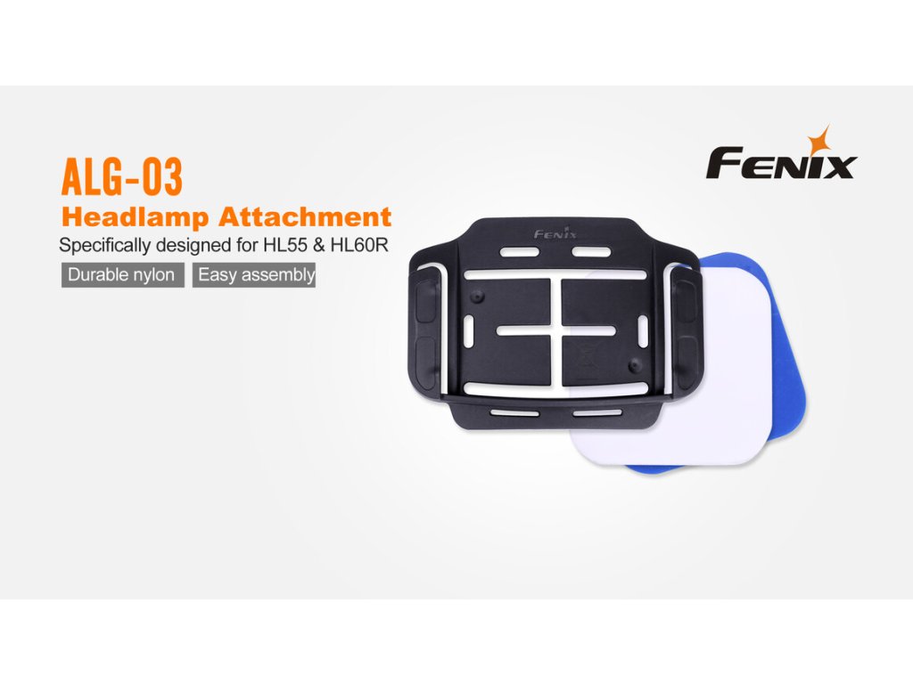 Fenix ALG-03 V2.0 slúži k jednoduchému uchytenie čeloviek Fenix HL55, HL60R, HM61R a HM65R (nie je kompatibilný s HM65R-T) na outdoorové, športové a pracovné prilby. Doštička držiaku sa na helmu prilepí, dodávanou obojstrannou samolepkou, čelovka bez popruhov sa do nej potom jednoducho zasunie.