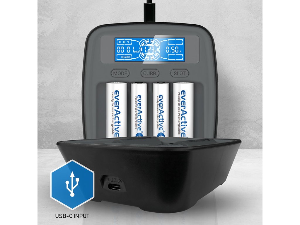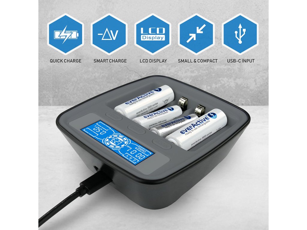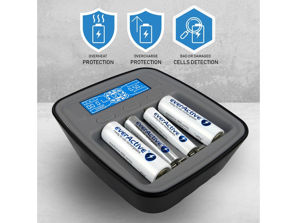 everActive NC1000M je mikroprocesorová nabíjačka batérií, typu Ni-MH a Ni-Cd, určená pre 1–4 kusy akumulátorov AA (R6) alebo AAA (R03). Je navrhnutá ako kompaktné a pritom profesionálne riešenie, pre domáce aj častejšie nabíjanie a testovanie batérií.