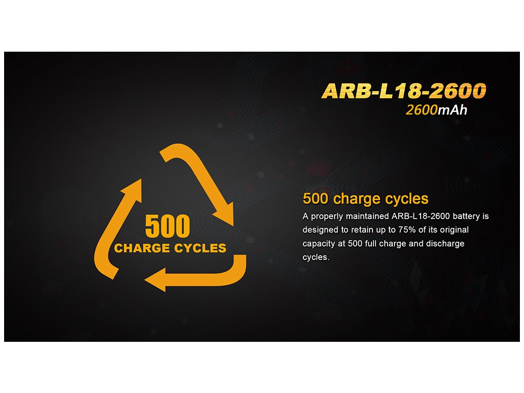 Špičkové nabíjateľné batérie Fenix 18650 2600 mAh (ARB-L2) s ochranou (protected) sú založené na lítiovo-ionovej technologii. Li-ion nabíjateľné batérie sa vyznačujú veľmi vysokou kapacitou, netrpia pamäťovým efektom a ani samovybíjaním. Li-ion vo veľkosti 18650 sú najlepšou voľbou z hľadiska uchovanej energie vzhľadom k rozmerom a váhe akumulátora.