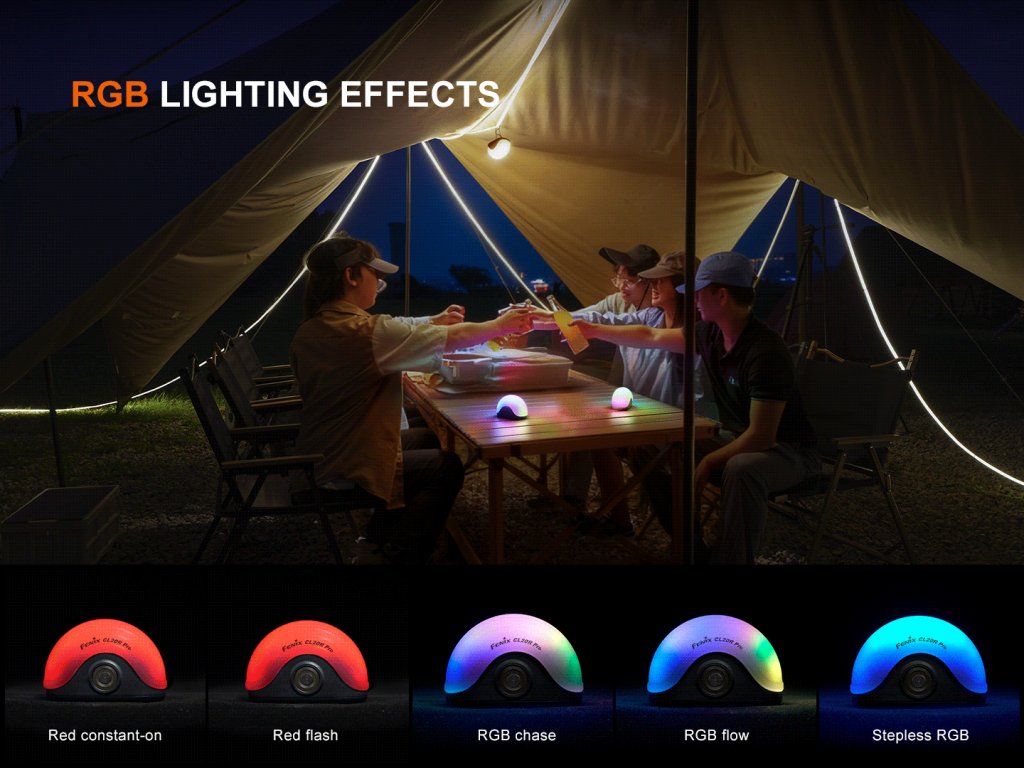 CL20R Pro je kompaktná a výkonná nabíjacia kempingová lucerna, ktorú môžete použiť na osvetlenie miestnosti, stanu či pracovného stola. Dvadsaťsedem vysoko jasných diód ukrytých pod pologuľovitým difuzérom poskytuje svetelný tok až 400 lúmenov (ANSI) s príjemným neutrálnym odtieňom bieleho svetla (3700 - 4200 K). Výhodou tohto odtieňa je prirodzenejšie a kontrastnejšie podanie farieb, ktoré neunavuje oči. Pre vytvorenie atmosféry je lucerna vybavená aj dvadsiatimi štyrmi RGB diódami pre farebné svietenie. Napájanie zabezpečuje vymeniteľný Li-ion akumulátor Fenix ARB-LP1900 s kapacitou 1900 mAh