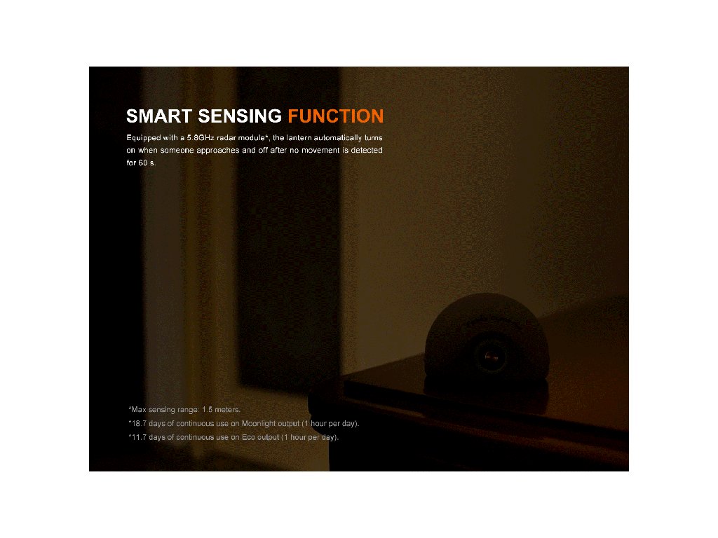 Inteligentný senzor pohybu - Ak je lucerna zapnutá do bieleho svetla a inteligentný senzor pohybu je aktívny, tak sa automaticky rozsvieti pri detekcii pohybu v dosahu 1,5 metra. Po 60 sekundách bez pohybu sa sama vypne.