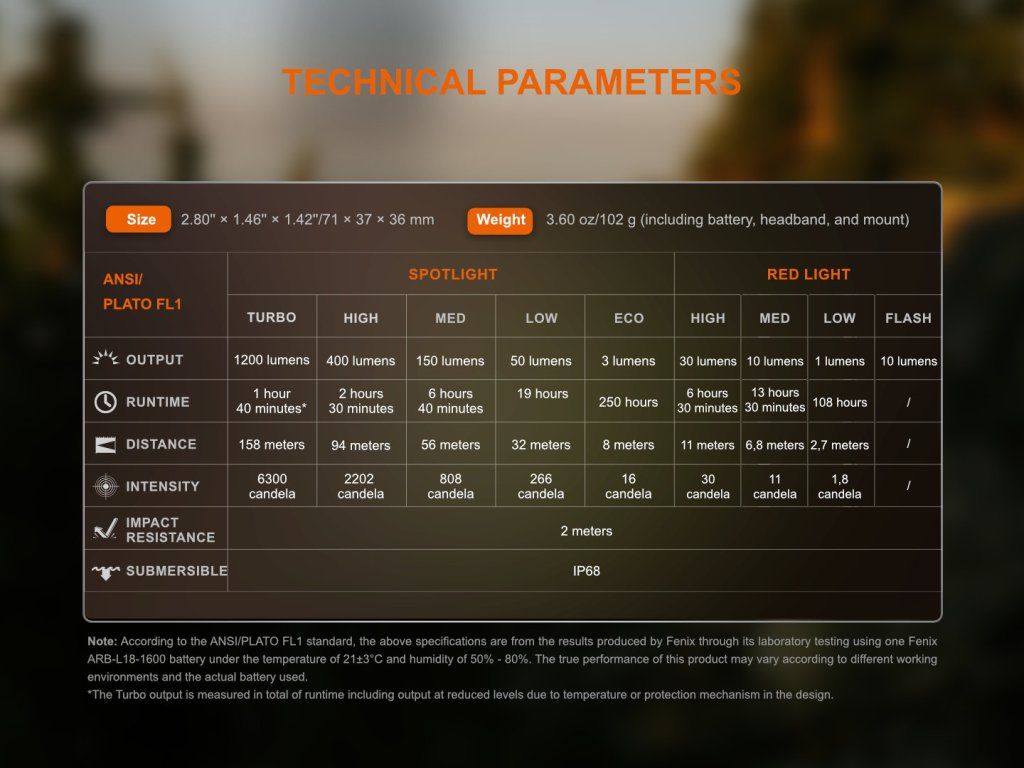 Ponúka oslnivý svetelný tok až 1200 lúmenov (ANSI) s dosvitom až 158 metrov. Jej hlavnou prednosťou je neutrálny odtieň bieleho svetla (4500 K), ktorý poskytuje vernejšie podanie farieb a oveľa lepší kontrast v prírode. Okrem bieleho reflektora je čelovka vybavená aj silným červeným svetlom s výkonom až 30 lúmenov. Svietidlo napája pribalený nabíjací akumulátor typu 18350 s kapacitou 1600 mAh, ktorý sa dobíja priamo v tele čelovky cez moderný USB-C konektor.