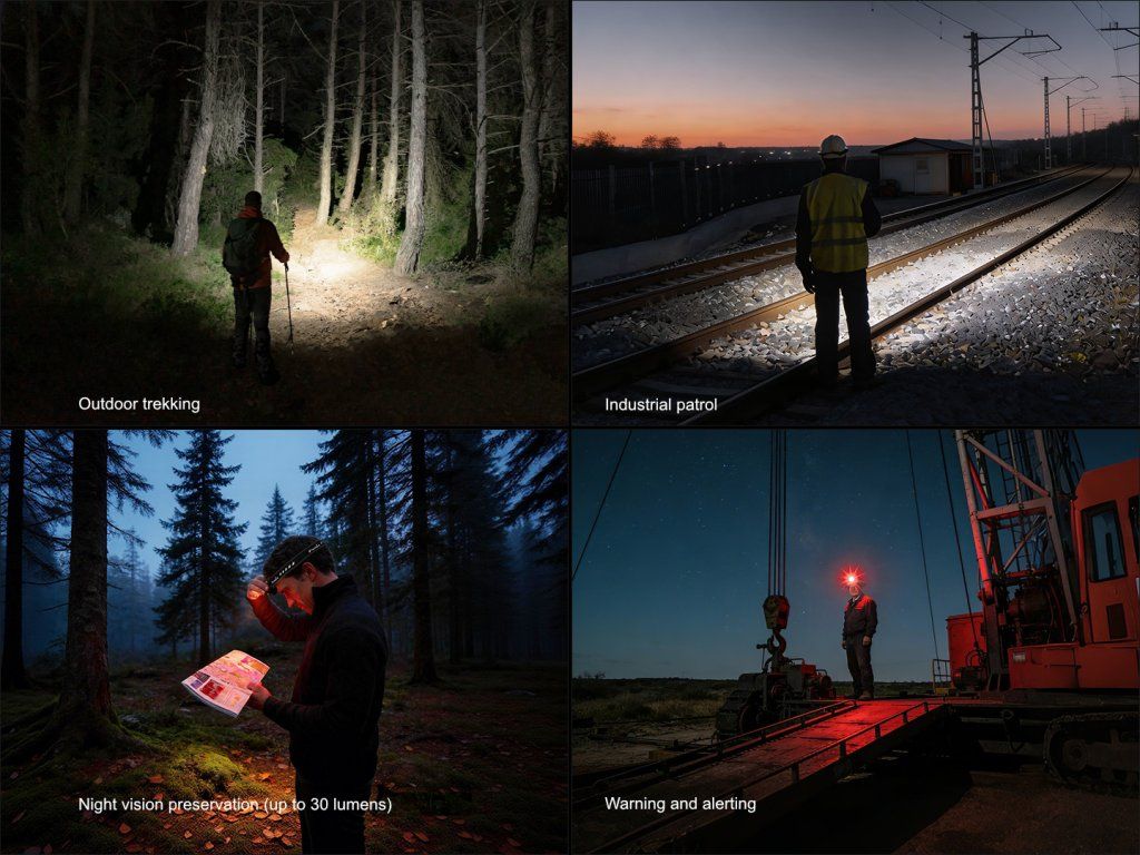 - Štyri režimy červeného svetla: 30 lúmenov (6,5 hodiny) -> 10 lúmenov (13,5 hodiny) -> 1 lúmen (108 hodín) -> červené blikanie 10 lúmenov (/).
