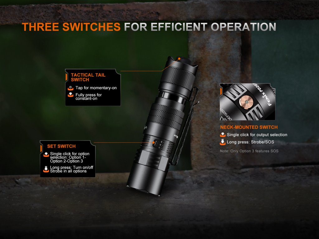 Pre zapnutie stlačte taktický spínač na konci svietidla, pre okamžitú aktiváciu ho iba zľahka stlačte. Stlačením bočného tlačidla pri hlave svietidla môžete kedykoľvek počas prevádzky cyklicky prepínať medzi režimami stáleho svietenia. Pre prepnutie do stroboskopu podržte bočné tlačidlo zhruba 0,5 sekundy. Pokiaľ máte zvolené Nastavenie 3 (outdoorové aktivity), tak jeho ďalším stlačením potom zapnete SOS. Opätovným podržaním bočného tlačidla sa vrátite do stálych režimov svietenia. Počet režimov, ktoré je možné prepínať, závisí od vami zvolenej predvoľby režimov, napríklad stroboskop je možné úplne deaktivovať (viď ďalej).
