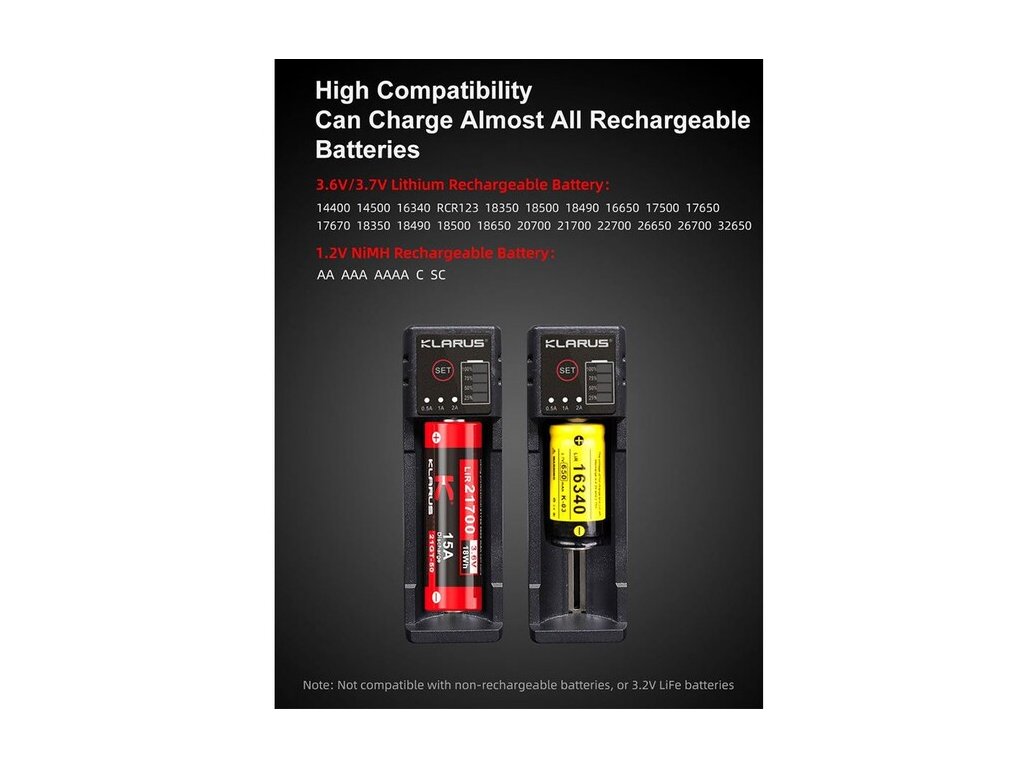 - Podporované akumulátory: 14400, 14500, 16340, RCR123, 16650, 17650, 17670, 18350, 18490, 18500, 18650, 19490, 20700, 21700 (aj s ochrannou elektronikou), 22700, 26650, 26700, 32650 Li-ion akumulátorov 3,6/ 3,7V a Ni-MH/ Ni-Cd: 1,2V AA, AAA, AAAA, C, SC akumulátorov