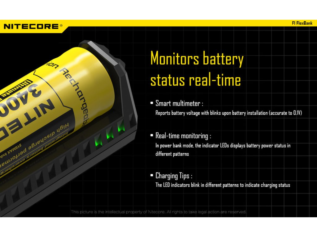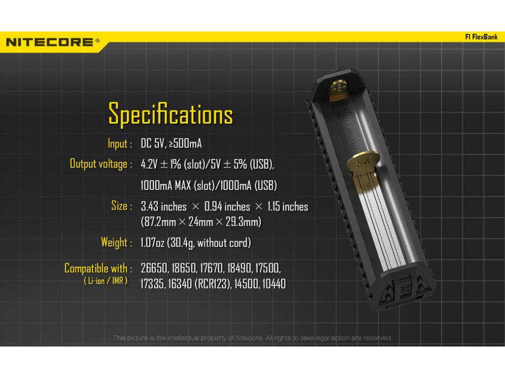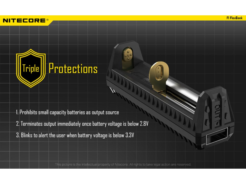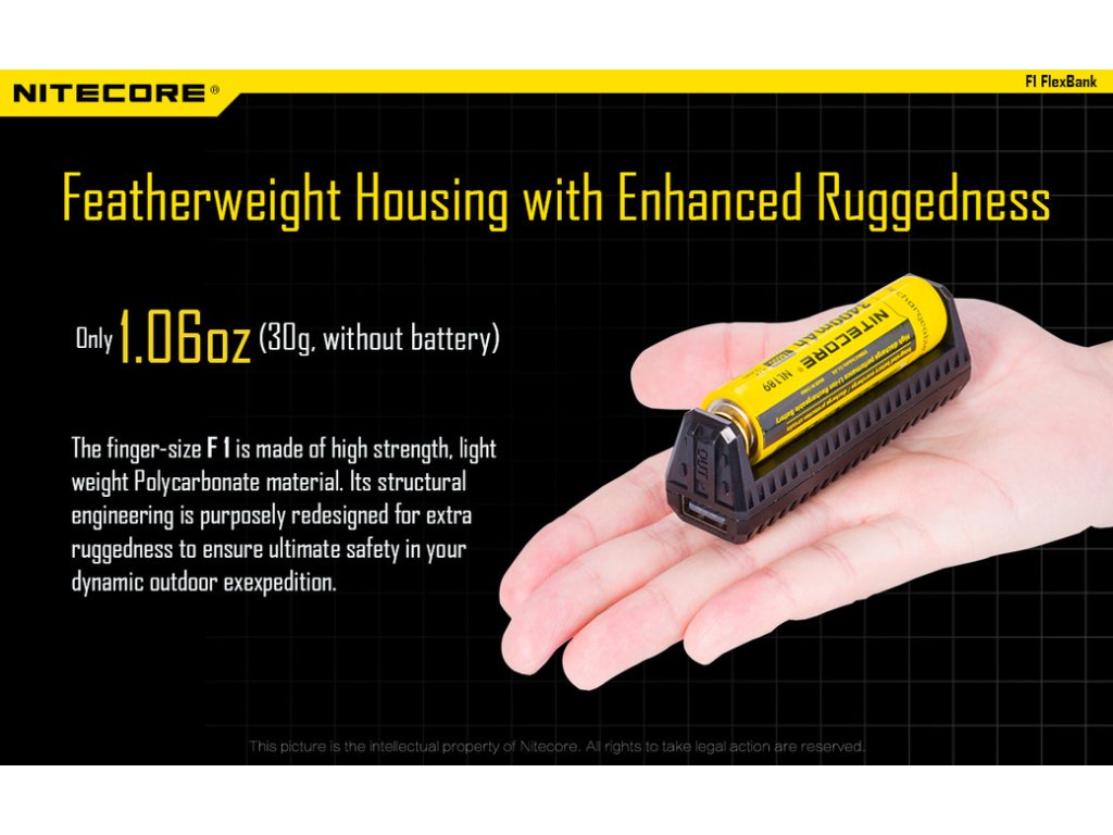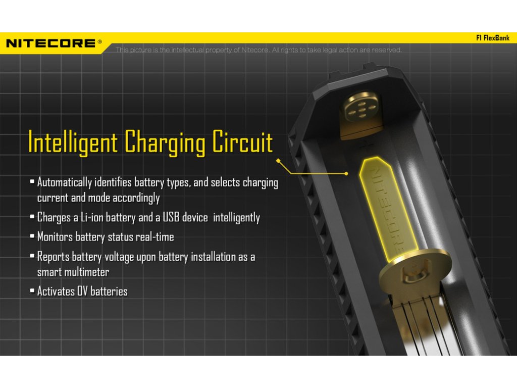 NITECORE UI1 je výkonná, kompaktná a prenosná Li-ion nabíjačka Micro-USB s jedným nabíjacím slotom, schopná dosiahnuť maximálny nabíjací prúd 800mA. Je kompatibilná s Li-ion/ IMR: 10340, 10350, 10440, 10500, 12340, 12500, 12650, 13450, 13500, 13650, 14430, 14500, 14650, 16500, 16340 (RCR123), 16650, 17350, 17500,17650, 17670, 18350, 18490, 18500, 18650, 20700, 21700, 22500, 22650, 25500, 26500, 26650. Indikátor nabíjania, poskytuje používateľom aktuálne vidieť stav nabitia Li-ion akumuátora v reálnom čase, v podobe blikania (svietenia) 3 fialových indikačných dielikov (v závislosti od štádia nabitia Li-ion akumulátora). Poskytuje tiež niekoľko druhov ochrany, aby sa zabránilo spätnej polarite, prebíjaniu a prehriatiu.
