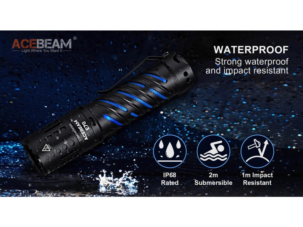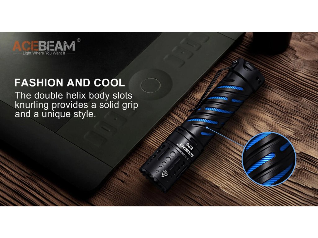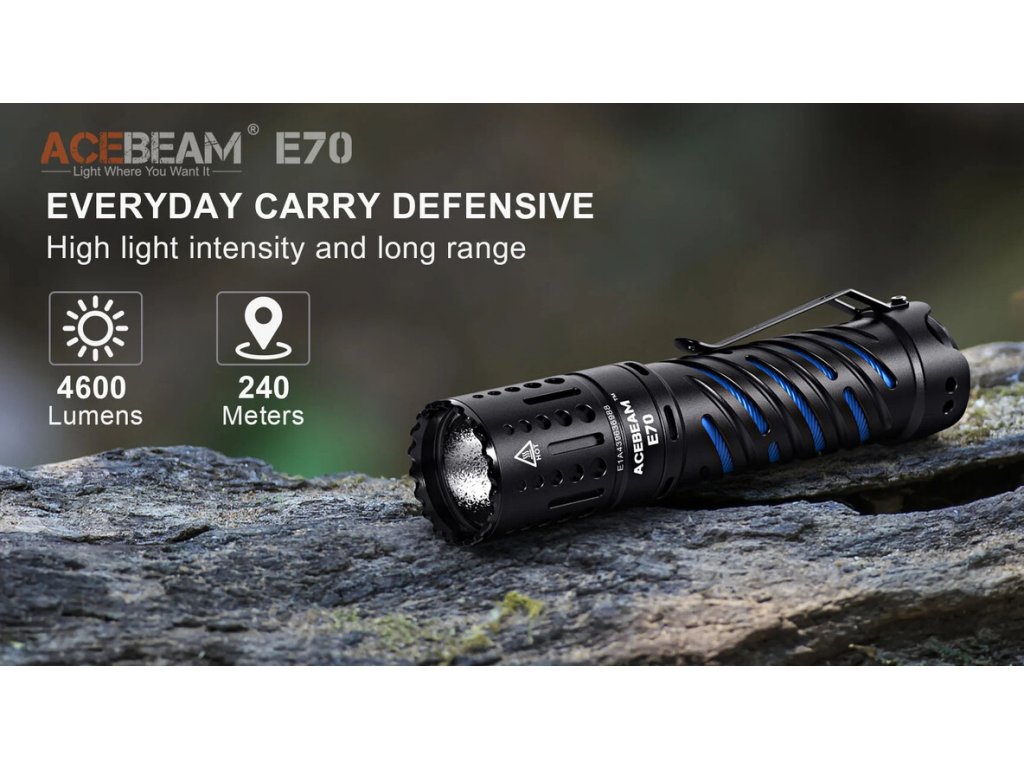Acebeam E70 AL patrí do skupiny EDC ručných LED bateriek, ktorú budete chcieť nosiť každý deň so sebou! Vďaka svojmu krásnemu vzhľadu (dvojité telo), úžasnému svetelnému výkonu 4600lm, svietivosti na vzdialenosť 240m a veľkosti dlane, si ľahko Acebeam E70 obľúbite! Telo je vyrobené z tvrdeného leteckého hliníka (AL). V hlave svietidla je osadená výkonná 1x XHP70.2 LED v studenom odtieni bieleho svetla 6000K. Dizajn a vyhotovenie zadného spínača, pôsobí úhľadne a moderne. Spínač má dômyselne vymyslenú ochranu, proti nechcenému zapnutiu (napr. vo vrecku nohavíc) a to takú, že je možné svietidlo zapnúť iba rýchlym dvojitým kliknutím. Unikátny dutý dizajn s dvojitým vnútorným telom, je štýlový, ale tiež zlepšuje účinnosť rozptylu tepla a účinne odvádza teplo z hlavy svietidla. Digitálna regulácia výkonu, umožňuje stály výkon počas celej doby svietenia. Inteligentný systém regulácie teploty ITS, poskytuje stabilitu a optimálny výkon. Táto ochrana proti prehriatiu, slúži na to, že vzhľadom k miniatúrnym rozmerom LED baterky a veľkému výkonu v najvyšších režimoch, elektronika ITS automaticky zníži jas, akonáhle dosiahne teplotu 60°C. Po znížení teploty sa dajú najvyššie režimy znova aktivovať. E70 je napájané na 1x USB-C nabíjateľný Li-ion 21700 3,7V akumulátor s kapacitou 5100mAh 20A 3,7V. Ponúka 6 režimov svietenia: Turbo 100%, 28%, 14%, 4%, 1%, 0,02% + 1 zábleskový režim STROBE. Zapnutie/ vypnutie a zmena režimov svietenia, prebieha pomocou spomínaného zadného spínača, vyrobeného z nehrdzavejúcej ocele (Stainless steel). Telo svietidla je vyrobený z odolného tvrdeného hliníka s vysokou pevnosťou, odoláva pádom z výšky 1m a je aj vodeodolné podľa štandardu IP68. Na tele svietidla je osadená aj praktická kovová spona, pre prichytenie svietidla napr. za opasok nohavíc. Svietidlo si pamätá posledný zvolený režim svietenia, okrem režimu Turbo 100% a Strobe. Vysoký výkon v tak malom tele (dĺžka iba 12,83cm), robí z E70 skvelé svietidlo na cestovanie, pátracie a záchranné operácie, pre dobrodruhov, outdoorových nadšencov, zberateľov, ochranárov a aplikácie v priemysle. Je to tiež dobrá voľba pre vašu novú kolekciu z rady E od spoločnosti Acebeam! Majte ich všetky!