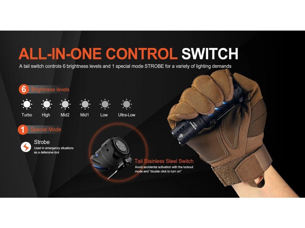 - Počet režimov: 7 Režimov - Turbo 100%-30%, 45%-30%, 19%, 9%, 3%, 1% + 1 zábleskový režim STROBE 50%