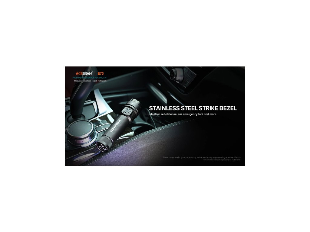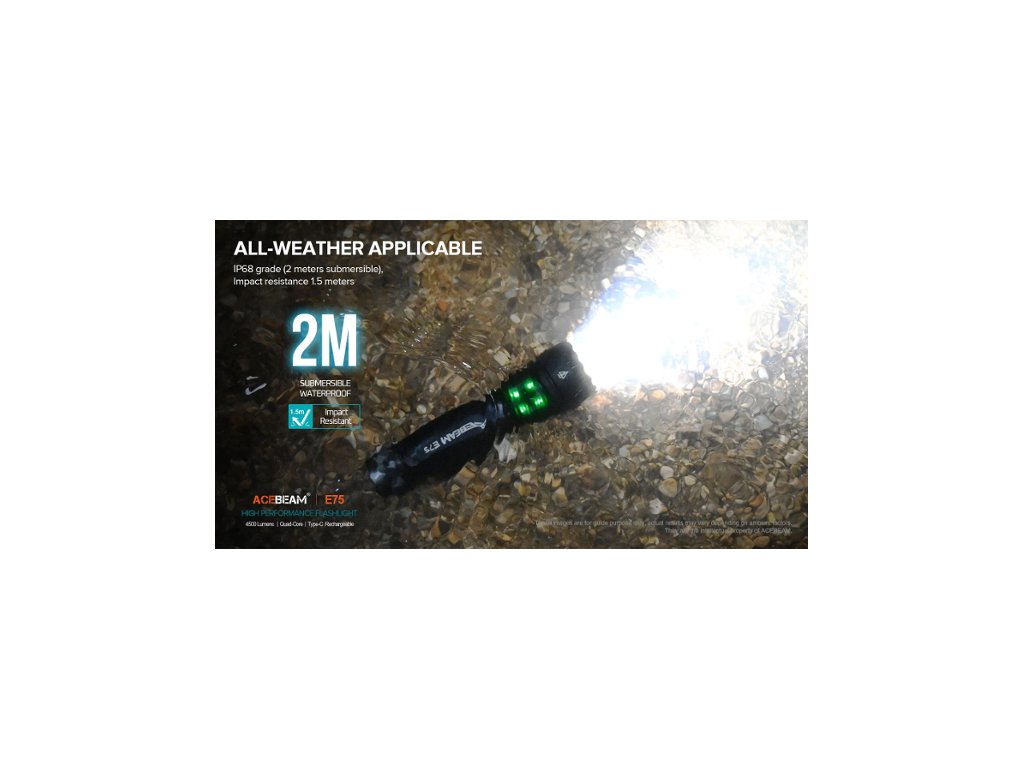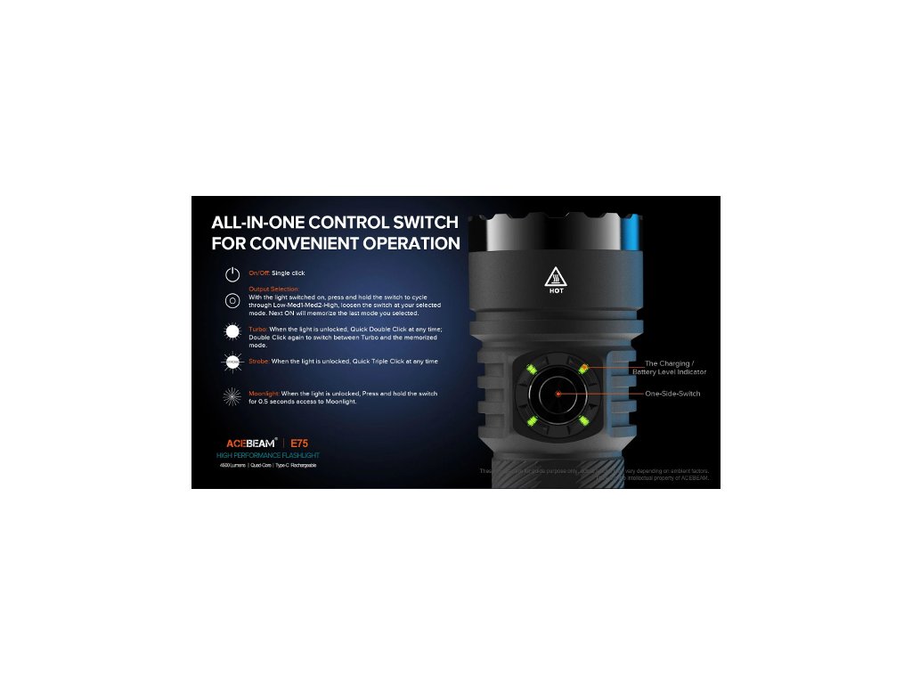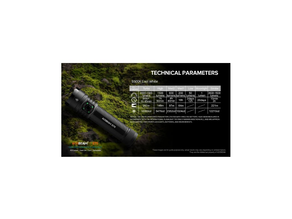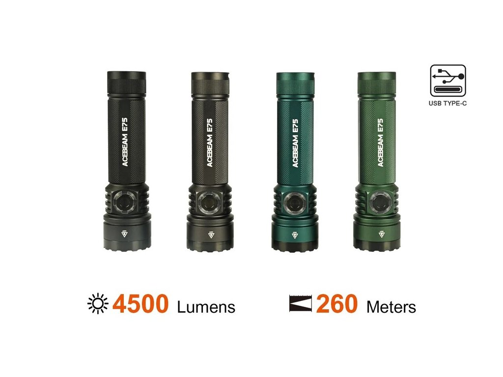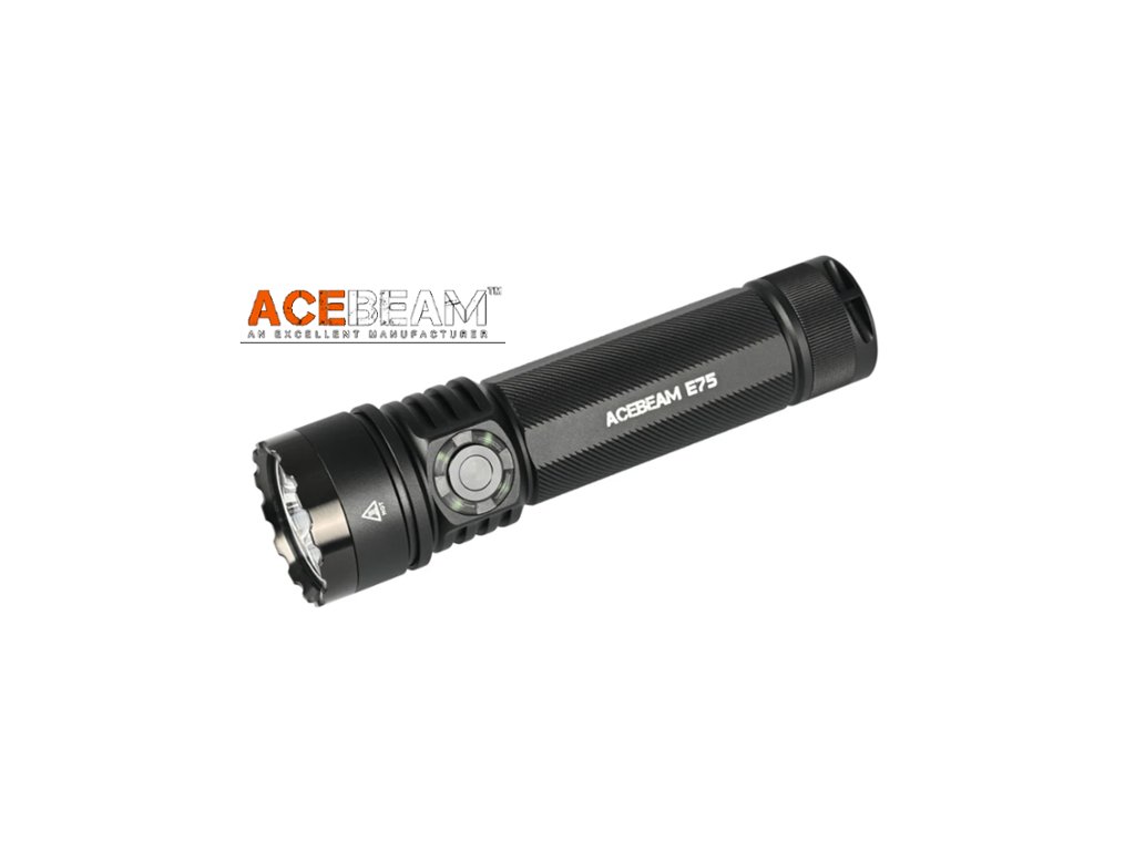 Pochádza zo série EDC, čiže svietidlá pre každodenné používanie. Acebeam E75 je vysoko výkonná LED baterka s max. svetelným výstupom 4500 lúmenov a dosahom svetla 260 metrov. Jeho 4x vysoko výkonné LED diódy, osadené v SMO-leštenom hladkom reflektore, ponúkajú plynulý lúč, pre osvetlenie veľkého priestoru z blízka, ale aj na veľkú vzdialenosť. Studený odtieňom svetla je jasnejší odtieň svetla a aj vykreslenie objektov je jasnejšie. Celkovo ponúka 6 režimov svietenia: 100%-33%, 33%, 13%, 4%, 1%, 0,02% + 1 zábleskový režim STROBE. Pre ovládanie svietidla, slúži bočný spínač, na hlave svietidla. Ten zabezpečuje rýchly a jednoduchý prístup k všetkým dostupným režimom svietenia+zábleskový režim STROBE. O aktuálnom stave vybitia/ nabitia Li-ion akumulátora IMR21700 s kapacitou 5000mAh 15A 3,6V (je obsahom balenia), vás informuje farebný LED indikátor, umiestnený okolo spínača, na hlave svietidla. Nabíjanie akumulátora, prebieha v tele svietidla, cez rýchly USB-C port 5V 2A. Port sa nachádza z opačnej strany hlavy svietidla, pod gumenou krytkou. Plne je nabitý, približne za 3hod. Zadné magnetické veko, umožňuje prichytenie svietidla o kovové povrchy a tým pádom mať voľné ruky. Telo je vyrobené z leteckého tvrdeného hliníka HA lll a má tvrdo eloxovaný antiabrazívny povrch. Vodotesné je podľa štandardu IP68 a je nárazuvzdorné do 1,5m. Vo vnútri tela svietidla (batériovej časti) sa nachádzajú pozlátené pružinky (kontakty). Úderný prstenec a dvojpolohová čierna závesná spona, sú vyrobené z nehrdzavejúcej ocele. Svietidlo Acebeam E75 je stvorené pre každodenné, ale aj profesionálne použitie, priemysel, outdoorové aktivity, turistiku.