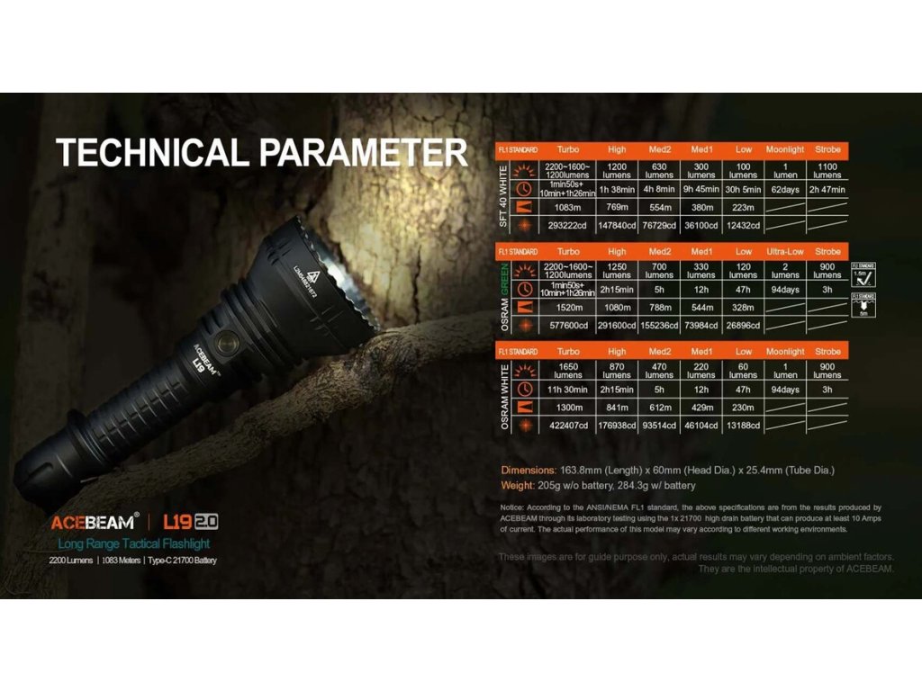 Acebeam L19 2.0 poskytuje svetelný výkon 2200lm a dosah svetla 1083m. V hlave svietidla je osadný najnovší typ LED 1x SFT40 HI v studenom odtieni bieleho svetla. Svietidlo sa vyznačuje kompaktným tvarom tela, pohodlným ovládaním a napájaním na Li-ion akumulutor Acebeam IMR 21700 5000mAh 15A, už s rýchlym USB-C nabíjaním, ktorý sa nachádza v balení. Aj vďaka hlbokému hladkému reflektoru a špeciílnej TIR optike v strede, ponúka dostatočné osvetlenie priestoru do diaľky. Používateľské rozhranie ovládania svietidla sa vyznačuje dvojicou spínačov, jeden na hlave svietidla a jeden na konci svietidla - zadný taktický spínač. Spínač za hlavou svietidla, slúži pre aktiváciu jednotlivých režimov svietenia. Ponúka 6 režimov svietenia a 1 zábleskový režim STROBE. Druhý taktický spínač je na konci tela svietidla, aktivuje svietidlo vždy v 100% režime svietenia. L19 2.0 je vodotesná podľa štandardu IP68 a odoláva aj nárazom z výšky 1m. Telo je vyrobené zo zlatiny tvrdeného leteckého hliníka. V batériovej časti tela svietidla sa nachádzajú z oboch strán kontaktov pozlátené strunky, ktoré umožňujú neustále svietenie, bez prerušenia, napr. pri spätnom ráze dlhej zbrane. LED ručná baterka L19 2.0 má aj pamäť režimov, čiže si pamätá posledný zvolený režim svietenia, pri opätovnom zapnutí spínačom, umiestneným na hlave svietidla. Nabíjanie Li-ion akumulátora 21700, prebieha mimo tela svietidla, samotný akumulátor má v tele integrovaný nabíjací USB-C port, umiestneného pri plusovom póle akumulátora. LED ručné svietidlo L19 2.0 je ideálnym spoločníkom pre poľovné účely, taktické použitie, ale dobre poslúži napr. aj na turistike.