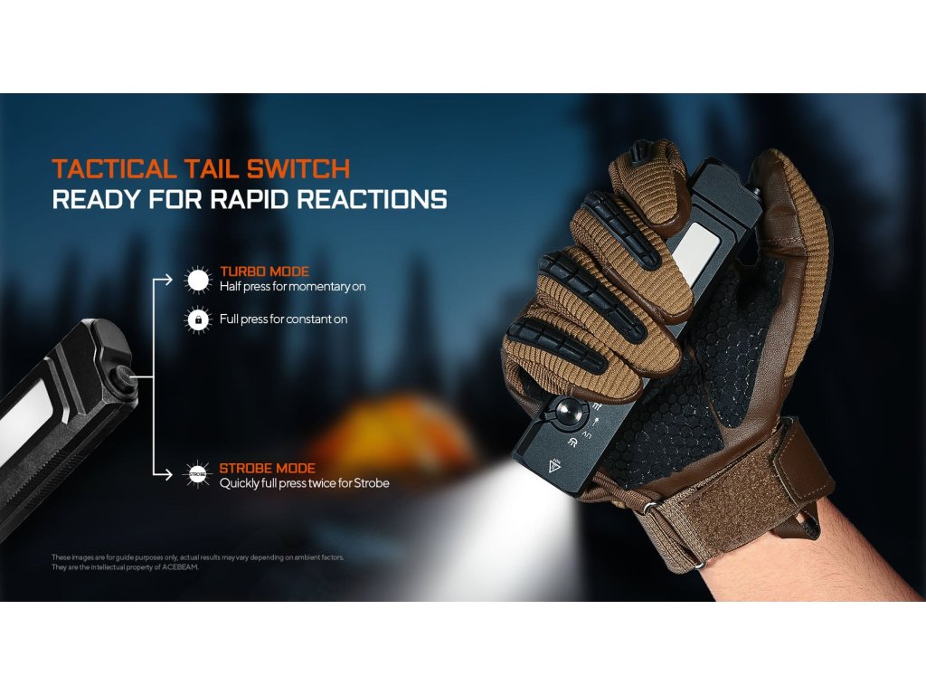 🔹 Ovládanie: inteligentné trojitý spínačový systém – bočný switch, rotačný magnetický selektor svetelných zdrojov a taktické zadné tlačidlo pre okamžitý Turbo / Strobe prístup.