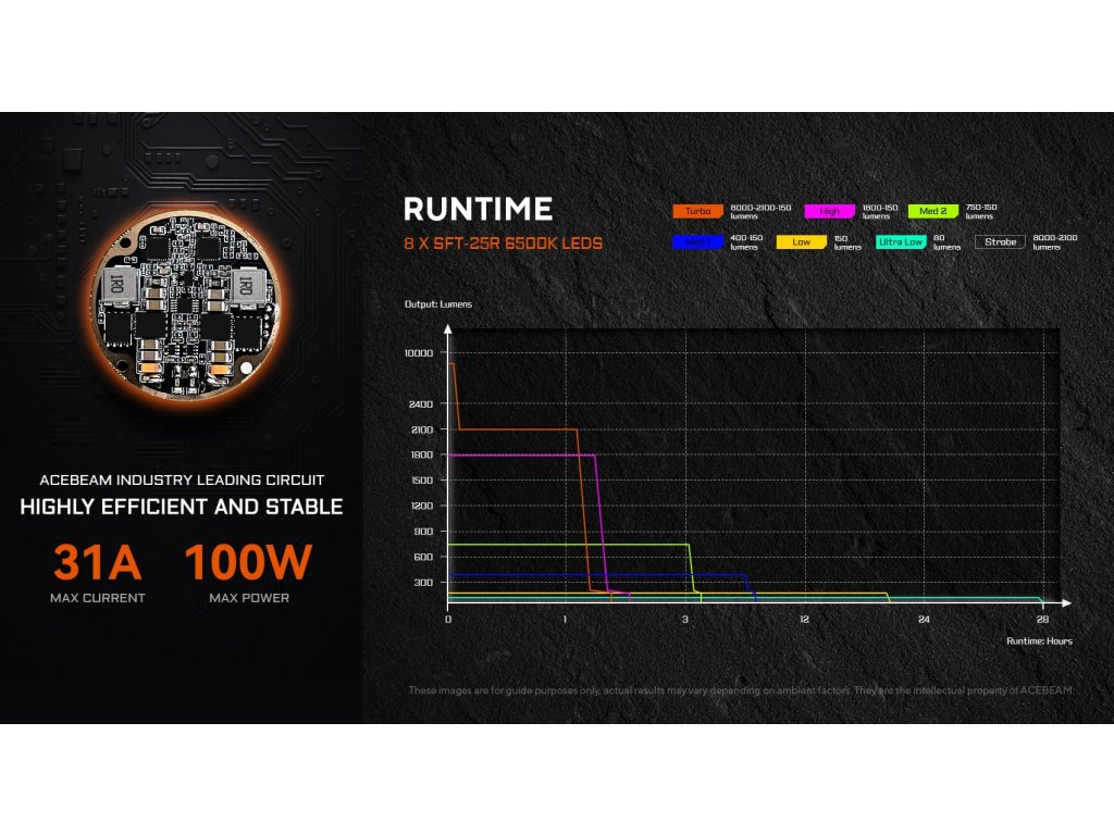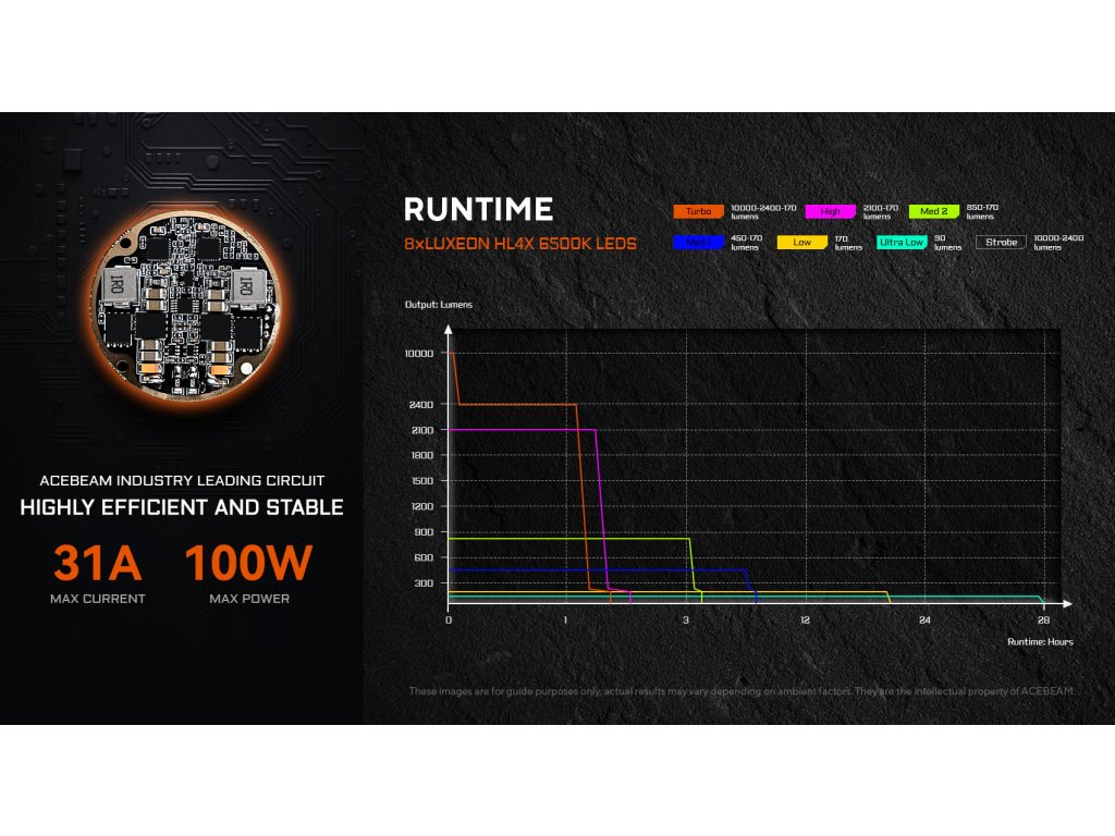| Turbo | 10 000 → 2400 → 170 lm | 440 m / 48 400 cd | 50 s → 1 h20 → 20 min |