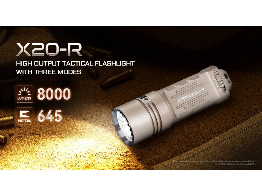 Acebeam X20‑R je špičkové taktické svietidlo, ktoré spája extrémny výkon (až 10 000 lm), dlhý dosvit (až 645 m) a kompaktné rozmery. S rýchlym prepínaním režimov, priamym nabíjaním USB‑C, mechanickou ochranou proti neželanému zapnutiu a robustným dizajnom (IP68, odolnosť pri páde) je X20‑R pripravený na najnáročnejšie výzvy – od hliadkovania a pátrania až po outdoorové expedície.