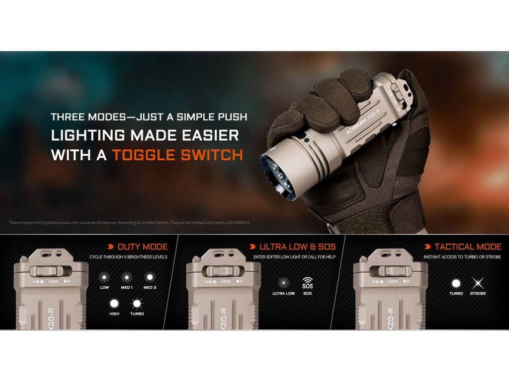 Má prepínač na rýchle prepínanie medzi režimami „Duty“, „Ultra Low/SOS“ a „Tactical“, plus dvojstupňový výstupný tlačidlový spínač pre okamžitý prístup k Turbo a Strobe. -