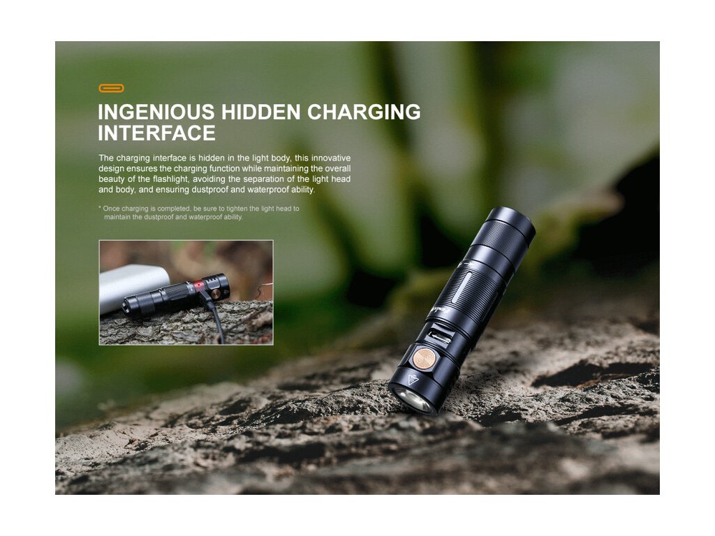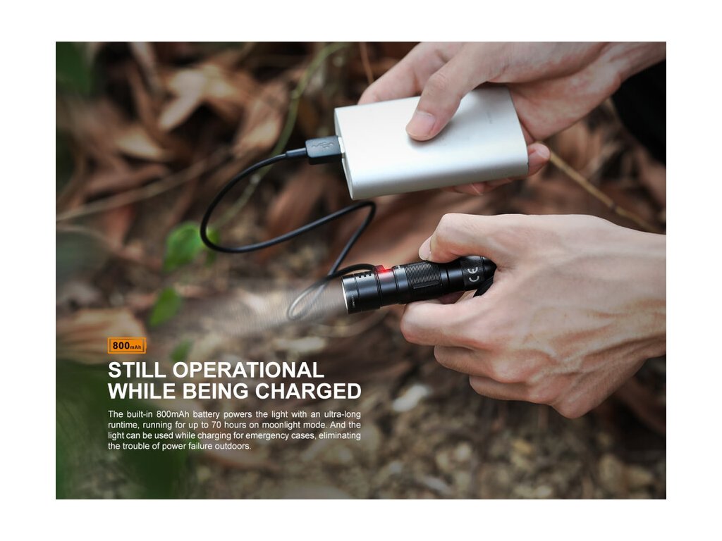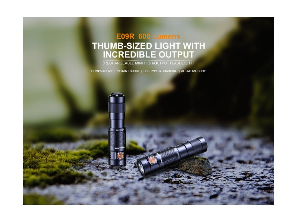 Nabíjateľná LED baterka Fenix E09R, ponúka aj napriek svojim minimálnym rozmerom a nízkej váhe 45 gramov, vysoký svetelný tok až 600 lúmenov (ANSI) v BURST režime. Svetelným zdrojom je výkonná LED Luminus SST-20, s ktorou možno dosvietiť do vzdialenosti 124 metrov. Disponuje piatimi svetelnými režimami, kedy na najnižší z nich vydrží nepretržite svietiť 70 hodín. Je napájaná vstavaným Li-pol akumulátorom s kapacitou 800 mAh, ktorý sa nabíja cez moderný USB-C konektor priamo vo svietidle. Samozrejmosťou je vysoká kvalita prevedenia, odolnosť a vodotesnosť, podľa štandardu IP68. LED baterka je svojimi vlastnosťami predurčená, aby slúžila ako malý a zároveň výkonný svetelný nástroj na každý deň. Pripnutá na kľúčoch, vo vrecku, v kabelke alebo batohu, iste veľa miesta nezaberie.