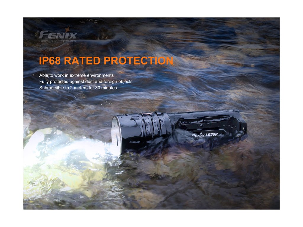 Nabíjacie svietidlo Fenix LR35R, prináša extrémny svetelný tok až 10 000 lúmenov (ANSI) a široký plynulý kužeľ s dosvitom až 500 metrov. Svietidlo je napájané dvoma vysoko prúdovými Li-ion akumulátormi, typu 21700 (súčasť balenia), ktoré je možné nabíjať priamo vo svietidle, cez moderný USB-C konektor. Mimoriadneho svetelného toku, bolo dosiahnuté použitím šiestich vysoko výkonných LED Luminus SST-40. K dispozícii je päť úrovní svietenie a oslepujúci zábleskový režim Strobe, pre núdzové situácie.