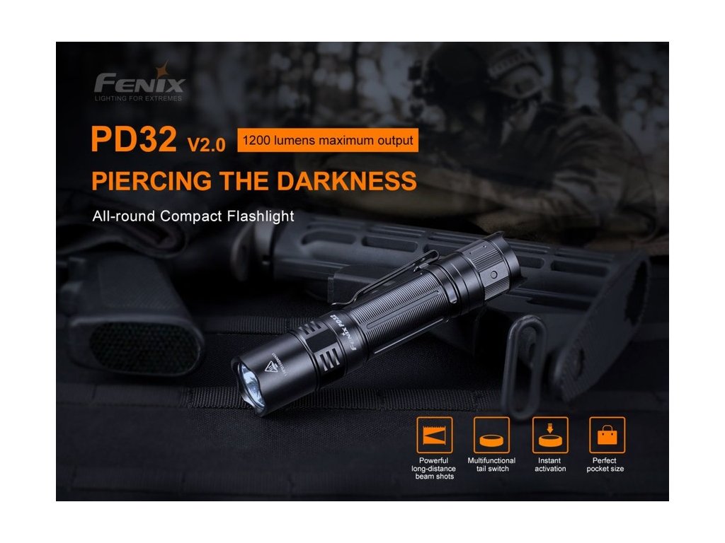 Šiesta generácia svietidla Fenix PD32 V2.0, ponúka extrémny svetelný tok až 1200 lúmenov (ANSI) a úctyhodný dosvit až 395 metrov. Nadštandardného dosvitu (vzhľadom k veľkosti svietidla) bolo dosiahnuté použitím špičkovej LED OSRAM KW CSLPM1.TG, ktorá vytvára veľmi dobre zaostrený kužeľ. Svietidlo je možné napájať z dvoch jednorazových CR123A batérií alebo jedného vysokokapacitného Li-ion 18650 akumulátora. Fenix PD32 V2.0 disponuje štyrmi rôznymi režimami svietenia, ktoré umožní voliť medzi vysokým výkonom, dlhou výdržou (až 82 hodín) a zábleskovým režimom pre upútanie pozornosti a krízové situácie. Stroboskop možno rýchlo aktivovať z vypnutého stavu pol sekundovým držaním stlačeného taktického tlačidla. PD32 V2.0 zaujme nielen kompaktnou veľkosťou a skvelým výkonom, ale aj možnosťou pripevnenia diaľkového káblového spínača Fenix AER-02. Môžeme ju preto odporučiť pre použitie v bezpečnostných zložkách aj bežné outdoorové a poľovné použitie.