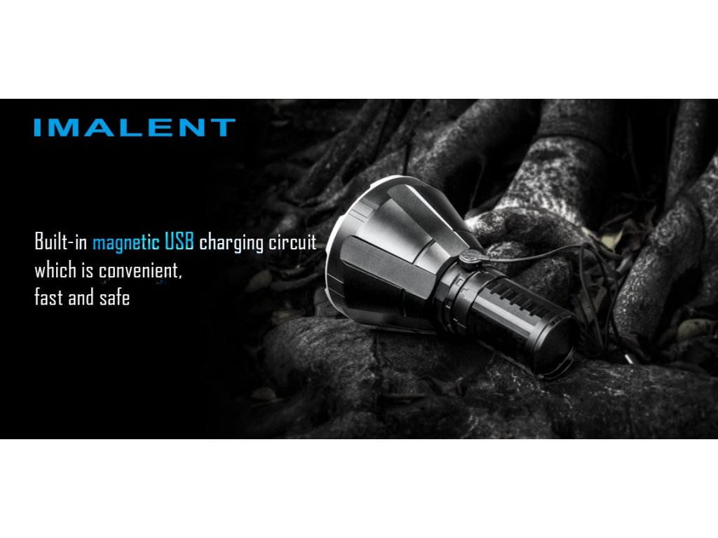 Svietidlo, USB kábel s magnetickým konektorom, 4x akumulátor IMALENT 18650 3000mAh 3,7V, šnúrka na zápästie, 2x náhradný tesniaci O-krúžok, manuál.