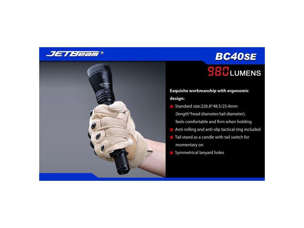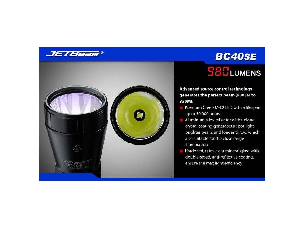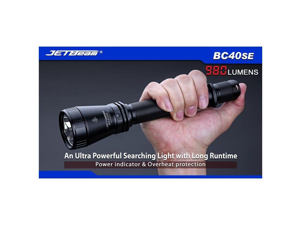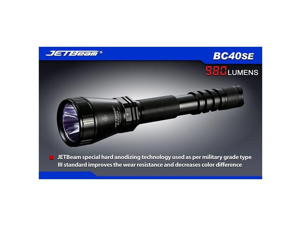JetBeam BC40 je vysoko výkonná LED baterka, ktorá používa Cree XML LED s výkonom až 830 lúmenov a dosvitom svetla až 344 metrov. Intuitívne užívateľské rozhranie je veľmi jednoduché pre zmenu režimu, stačí otočiť hlavou svietidla z vysokého výkonu na nízky režim a samotné svietidlo sa zapína taktickým spínačom na konci svietidla. Typ III tvrdo eloxovaný povrch z aero kvalitnej hliníkovej zliatiny tela vytvára svietidlo extrémne odolné voči vonkajším vplyvom. Táto univerzálna baterka je vynikajúca pre lov, strážne služby, pátracie a záchranne zložky atď.