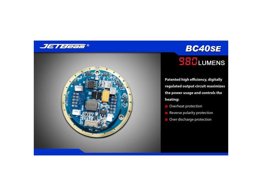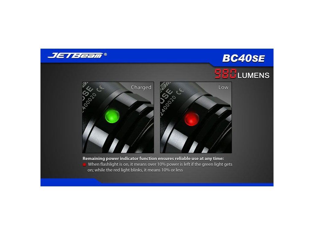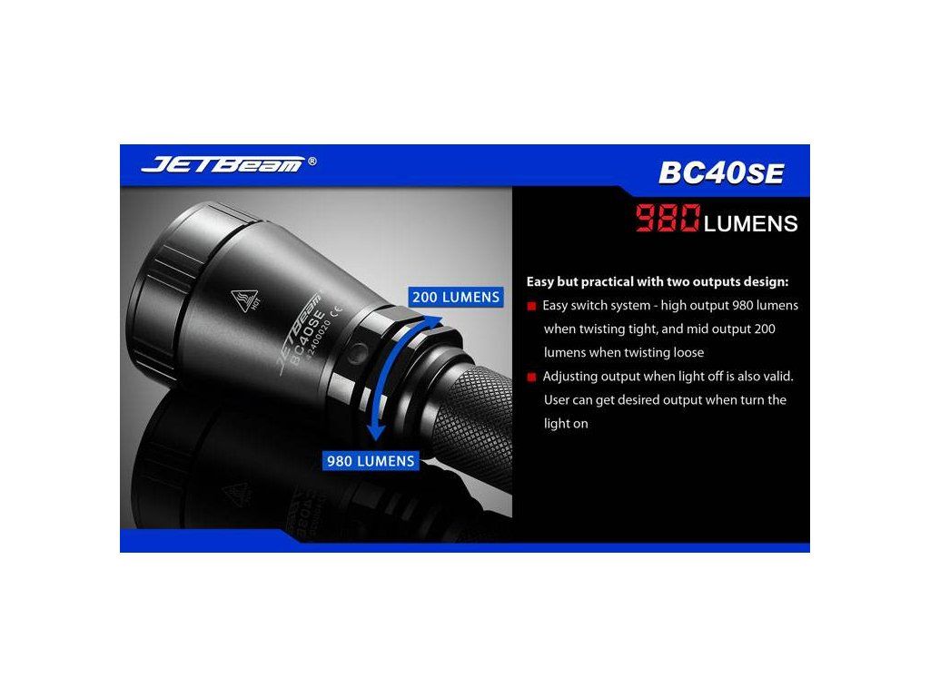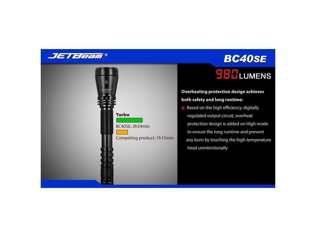 JetBeam BC40 je vysoko výkonná LED baterka, ktorá používa Cree XML LED s výkonom až 830 lúmenov a dosvitom svetla až 344 metrov. Intuitívne užívateľské rozhranie je veľmi jednoduché pre zmenu režimu, stačí otočiť hlavou svietidla z vysokého výkonu na nízky režim a samotné svietidlo sa zapína taktickým spínačom na konci svietidla. Typ III tvrdo eloxovaný povrch z aero kvalitnej hliníkovej zliatiny tela vytvára svietidlo extrémne odolné voči vonkajším vplyvom. Táto univerzálna baterka je vynikajúca pre lov, strážne služby, pátracie a záchranne zložky atď.
