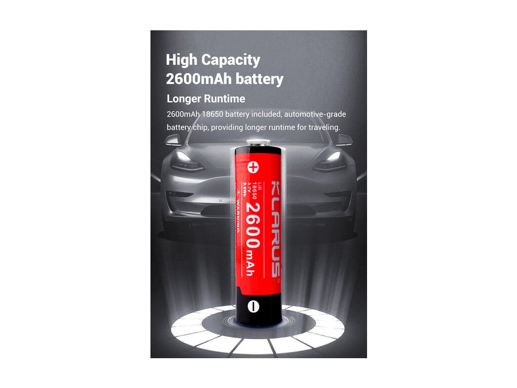 Svietidlo, šnúrka na zápästie, 1x Li-ion akumulátor Klarus 18650 2600mAh 3,7V, nabíjací USB-C kábel, 1x náhradný tesniaci O-krúžok. Balenie obsahuje akumulátor/ batériu.