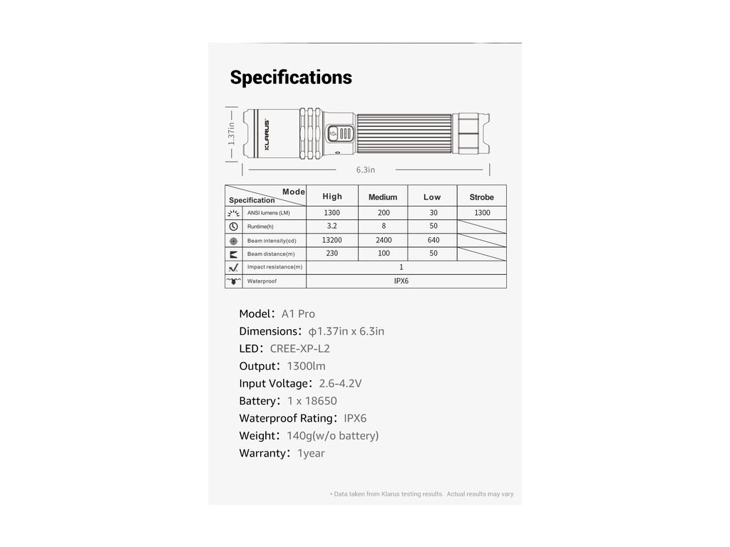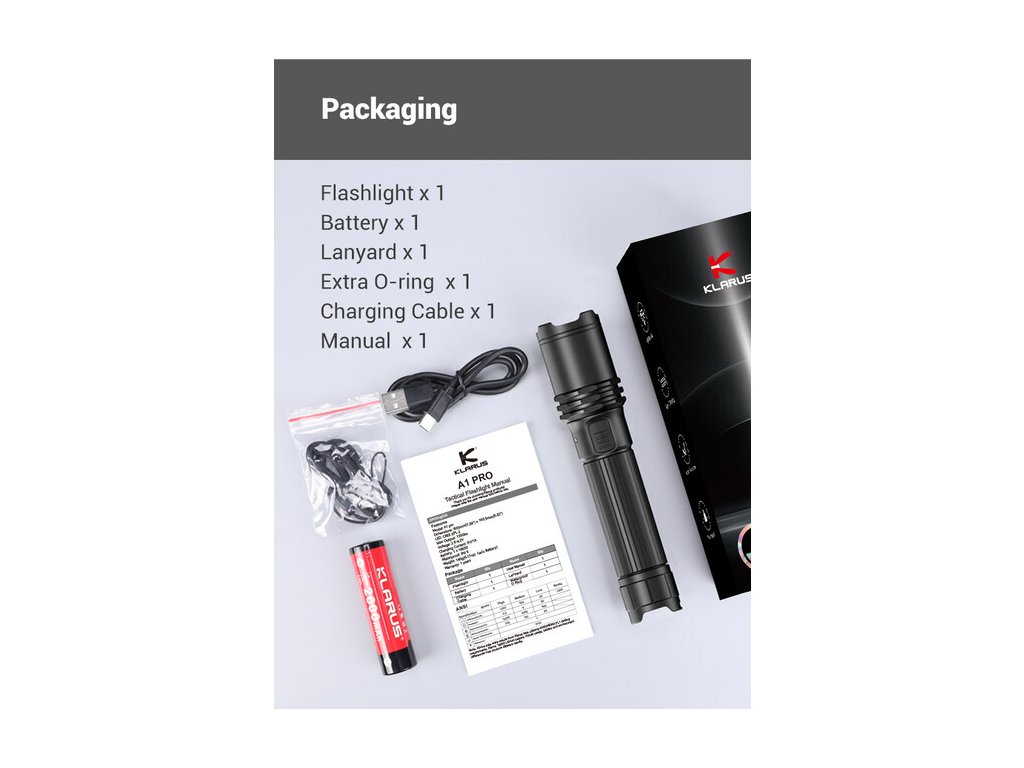 Klarus A1 Pro je odolná taktická LED baterka s rýchlym USB-C nabíjaním. Oproti verzii Klarus A1, bol pridaný do balenia 1x Li-ion akumulátora 18650 so s výšenou kapacitou 2600mAh 3,7V, umiestnený priamo v tele svietidla. V hlave A1 Pro je osadená výkonná 1x Cree XP-L2 LED v dennom odtieni bieleho svetla, ktorý je pre ľudské oko prirodzenejší a aj podanie farieb je vierohodnejšie, ako pri použití studeného odtieňu svetla. Maximálnym svetelným výstup bol zvýšený na 1300lm. Dosvieti na vzdialenosť 230m. A1 Pro má rovnaký počet režimov, ako verzia A1. Celkovo 4 svetelné režimy: 100%, 16%, 2% a 1 zábleskový režim STROBE 100%. USB-C port je umiestnený z bočnej strany a je ukrytý pod hlavou svietidla, ktorú treba najskôr z časti odskrutkovať, až kým sa neukáže spomínaný USB-C port. Pre zmenu režimov, má svietidlo 2 spínače, ktoré sú umiestnené z boku tela svietidla. Sú ľahko prístupné aj v rukaviciach. Použite väčší spínač z dvojice spínačov zapnutia/ vypnutia, pre zapnutie/ vypnutie posledného zvoleného režimu svietenia a pomocou menšieho spínača z logom blesku, aktivujete behom sekundy, zábleskový režim STROBE. V balení je dodávaný 1x Li-ion akumulátor Klarus 18650 s kapacitou 2600mAh 3,7V. Pod hlavou svietidla sa pri spínačoch nachádza aj 1x okrúhla modrá LED indikácia, ktorá slúži ako indikácia aktuálneho stavu nabíjania/ vybíjania akumulátora. Klarus A1 Pro má aj ochranu polarity, aby nedošlo k poškodeniu v dôsledku nesprávneho vloženia akumulátora. Z prednej strany chráni hlavu svietidla kovový prstenec, ktorý sa hodí aj pri sebaobrane alebo v situáciách, kedy treba rozbiť sklo. Telo je vyrobené z kvalitného tvrdeného leteckého hliníka HAIII. Spĺňa vodeodolnosť podľa štandardu IPX-6 a odoláva pádom z výšky 1m. Je to ideálne taktické svietidlo pre profesionálov vojenských a policajných zložiek, ale aj na bežné použitie napr. turistiku, kempovanie, atď.