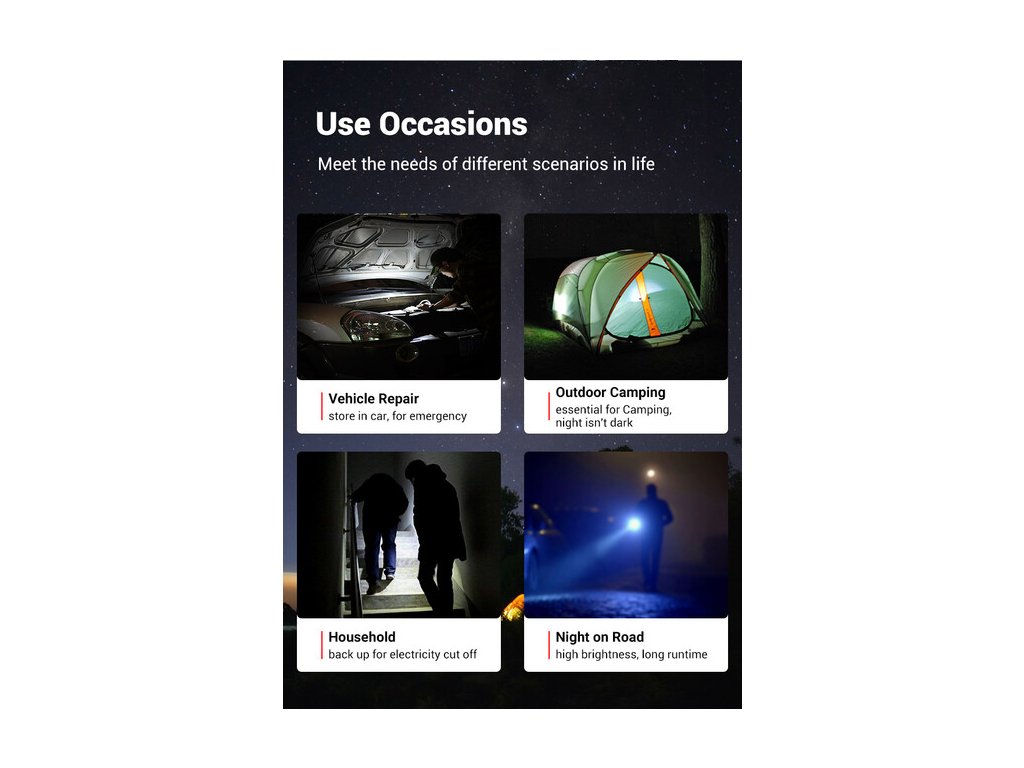 - Doba svietenia: 3,2hod. (1300lm-100% výkon), 8hod. (200lm-16% výkon), 50hod. (30lm-2% výkon)