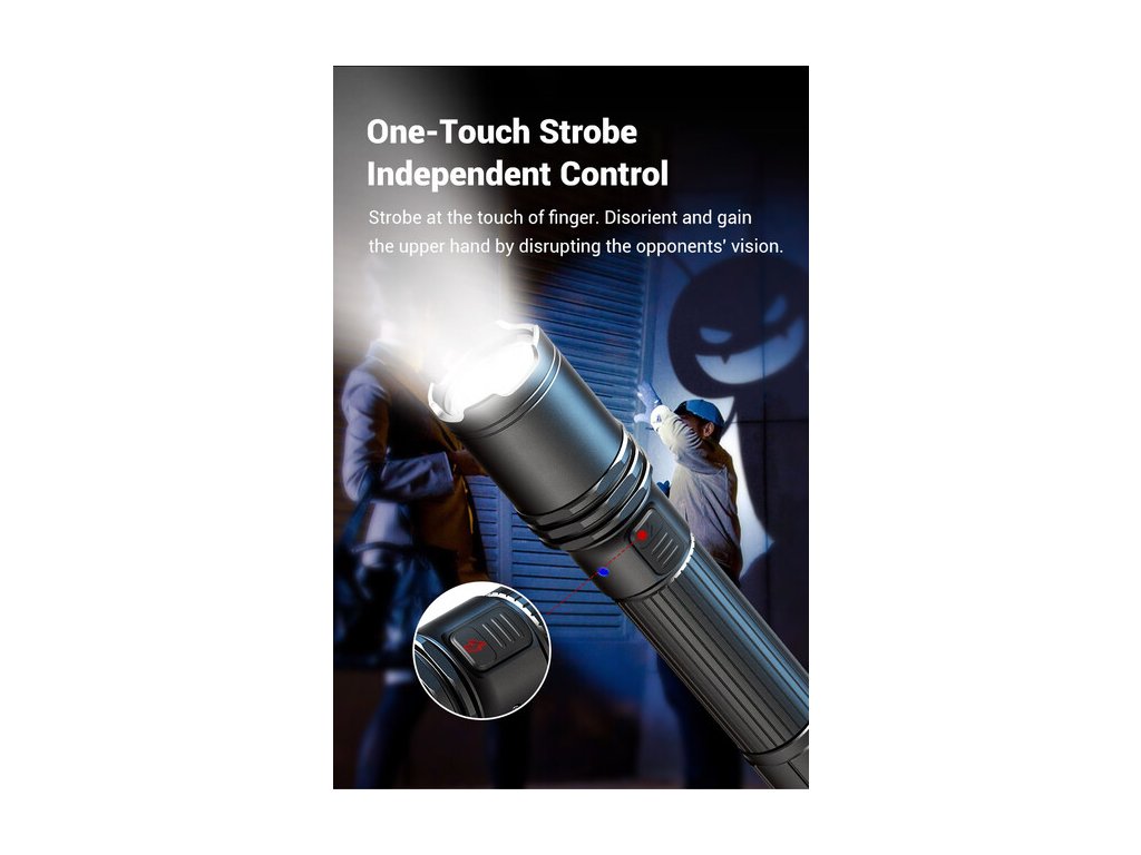 Pomocou menšieho spínača z logom blesku a jeho stlačením, aktivujete behom sekundy v zapnutom/ vypnutom stave, zábleskový režim STROBE. Opätovným stlačením spínača, svietidlo vypneme.