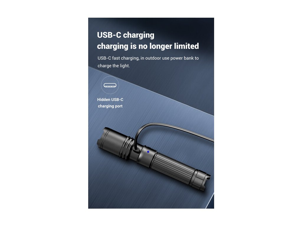 USB-C port je umiestnený z bočnej strany a je ukrytý pod hlavou svietidla, ktorú treba najskôr z časti odskrutkovať smerom do prava, až kým sa neukáže spomínaný USB-C port. Pripojte priložený USB-C káblik do konektora USB-C. Druhý koniec kábla s USB koncovkou, pripojte napr. do USB portu PC. Pre nabíjanie využíva štandardný USB port, takže môžete akumulátor nabíjať doma, v kancelárii, vo vozidle alebo kdekoľvek, kde máte k dispozícii USB port. Li-ion akumulátor 18650 umiestnený v tele svietidla sa začne nabíjať.