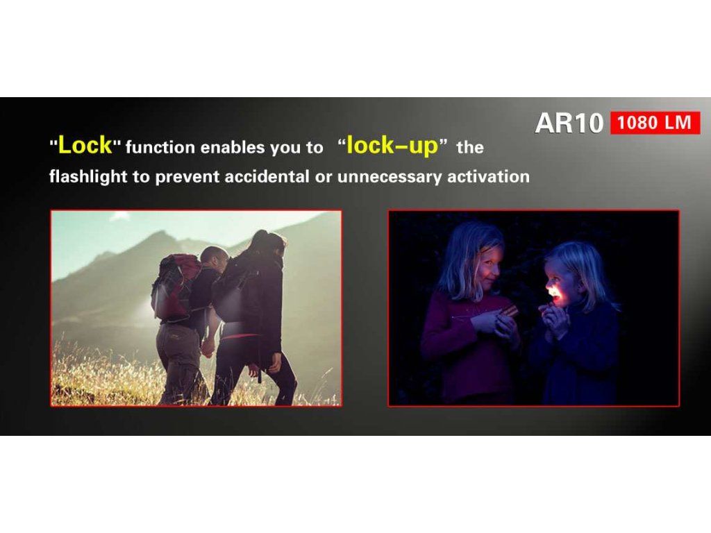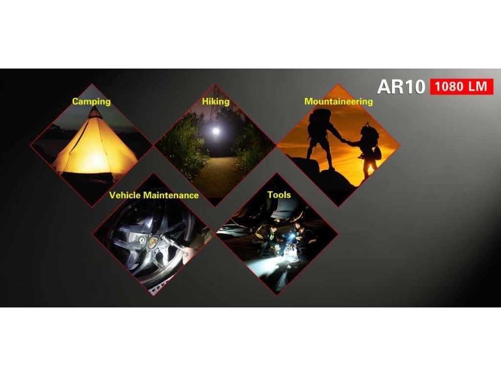 Klarus AR10 je výkonná a kompaktná ručná LED baterka s otočnou hlavou až o 90°. Je veľmi praktická. Je v nej osadená výkonná Cree XM-L2-U2 LED, ktorá je schopná generovať ohromujúcich 1080 lumenov svetla a vzdialenosť na ktorú dosvieti je 153 metrov. Svietidlo má štyri režimy intenzity svietenia a dva zábleskové režimy STROBE a SOS. Všetky režimy sú ľahko prístupné a cyklicky sa opakujú použitím bočného spínača/ prepínača režimov, ktorý umožňuje jednoduché ovládanie. V tomto tlačidle je umiestnená aj farebná LED indikácia aktuálneho stavu priebehu nabíjania. Indikácia slúži aj počas štandardnej prevádzky, kedy zmenou jej farby zobrazuje aktuálny stav vybitia akumulátora. Svietidlo Klarus AR10 je napájané buď na jeden akumulátor 18650 3,7V, alebo dve batérie CR123A 3V. Maximálna doba svietenia na najnižšom svetelnom režime je 220 hodín na jedno nabitie. Nabíjanie prebieha pomocou USB kábla. Akumulátor sa nabíja priamo v tele svietidla, takže nie je potreba samostatnej nabíjačky. Svietidlo je vybavené inteligentným systémom riadenia teploty a ochranou proti opačnému vloženiu akumulátora. Všetko je ukryté v jeho tele vyrobeného z tvrdeného leteckého eloxovaného hliníka, ktoré chráni LED baterku pred poškodením. Svietidlo je určené pre vyznávačov kempingu, cestovateľov, turistov, ale svoje uplatnenie nájde aj v záchranných zložkách, pri prácach okolo auta a svoje miesto má aj ako pomocník pri práchach v garáži.