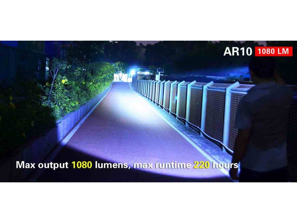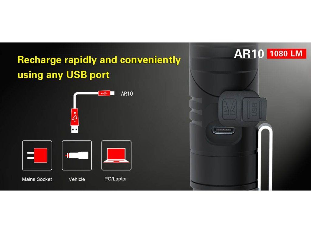 Klarus AR10 je praktickým pomocníkom v tme s nabíjaním v tele svietidla. Používa XM-L2 U2 LED s výkonom 1080lm a dosahom 153m. Vhodným akumulátorom je 1x 18650 alebo 2x CR123. Svietidlo disponuje 6 režimami a textúrovaným reflektorom. Spĺňa IPX-8.