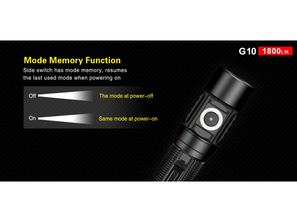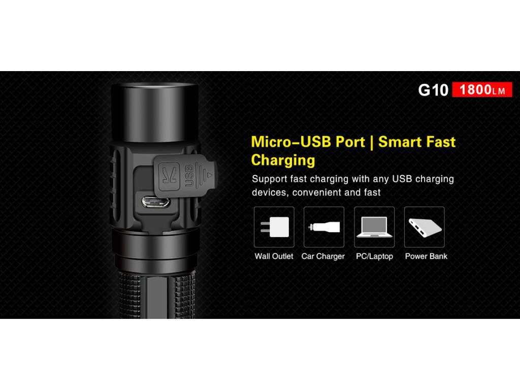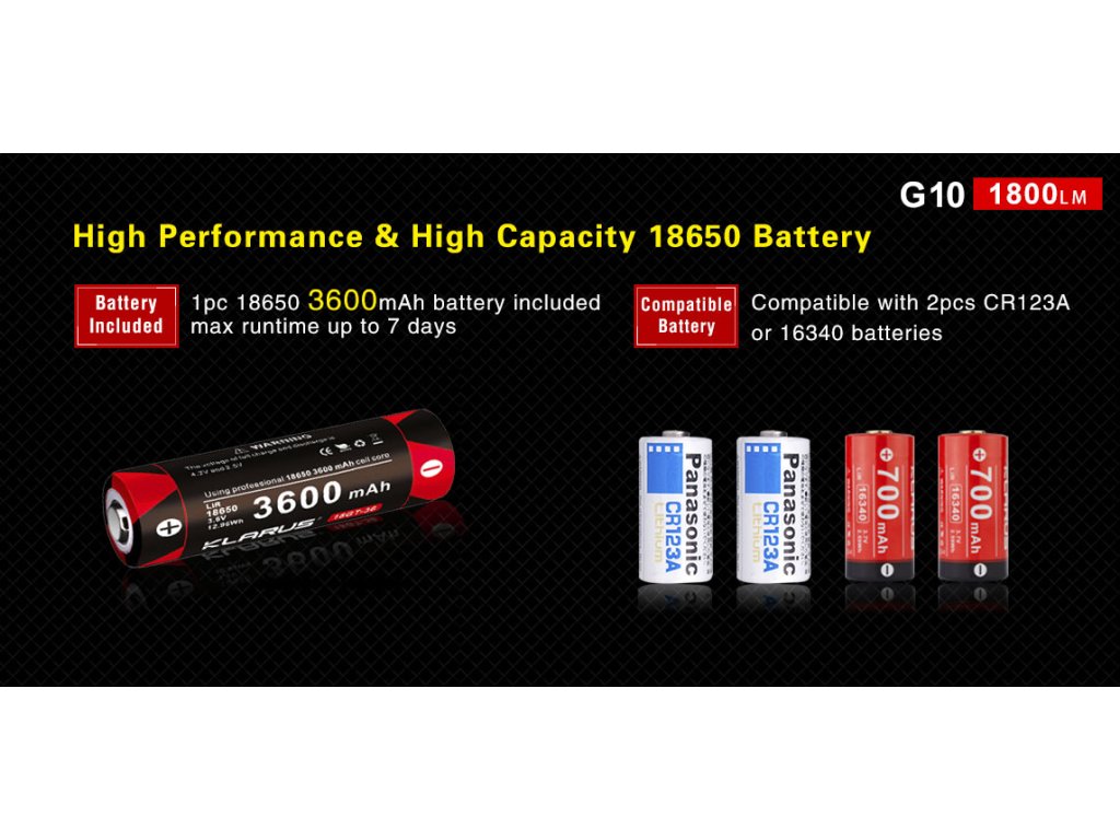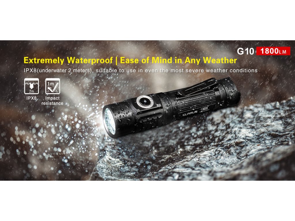 Klarus predstavuje LED baterku G10, ktorá poteší nielen svojím extrémnym výkonom, ale aj praktickosťou a možnosťou nabíjania Li-ion akumulátora 18650 priamo v tele svietidla, prostredníctvom micro USB vstupu. V have svietidla bola osadená moderná a extrémne výkonná CREE XHP35 HD E4 LED v studenom odtieni svetla. Ponúka štyri úrovne jasu svietenia, vrátane režimu Turbo, ktorý je 1800 lúmenov. Vzdialenosť na ktorú Klarus G10 dosvieti je 250 metrov. Klarus v tomto svietidle prináša spoľahlivosť a overený výkon. Jeden z režimov je aj tzv. ultranízky pre čo najvyššiu výdrž 170hod. K dispozícii sú aj dva zábleskové režimy: STROBE a SOS. Napájanie zabezpečuje jeden 18650 Li-ion akumulátor s kapacitou 3600mAh 3,6V (súčasť balenia). G10 má unikátny duálny spínač - jeden umiestnený za hlavou svietidla a druhý na konci tela svietidla. Má unikátnu vlastnosť a to tú, že umožňuje užívateľovi LED baterku zapnúť/ vypnúť a tiež prepínať z rôznych úrovní jasu. Spínače majú možnosť uzamknutia svietidla, aby sa nezaplo neúmyselne. V bočnom spínači je aj umiestnená farebná LED indikácia aktuálneho stavu vybitia akumulátora. Indikácia slúži počas štandardnej prevádzky, kedy zmenou jej farby zobrazuje aktuálny stav vybitia akumulátora. Má vodeodolnosť podľa štandardu IPX-8 a odolnosť proti nárazu z výšky do 1m. V hlave svietidla je zabudovaný mechanizmus, ktorý reguluje teplotu LED baterky, takže teplota zostane na znesiteľnej úrovni. Má aj ochranu proti opačnému vloženiu akumulátorov (opačná polarita). Svietidlo má minerálne sklo objektívu s ohniskovou vzdialenosťou, ktoré je super jasné a bolo zušľachtené a potiahnuté filmovým AR pokovovaním, ktoré slúži proti poškriabaniu. Reflektor má schopnosť dať široký lúč s dostatočne dlhým dosahom svetla. Telo je vyrobená z Type III leteckého tvrdeného hliníka, vojenského štandardu. Je obrábané na kvalitných CNC prístrojoch. Svietidlo je vhodné pre vyznávačov turistiky, kempovania, dobrodružných ciest, ale je tiež vhodné pre záchranné a pátračské zložky.