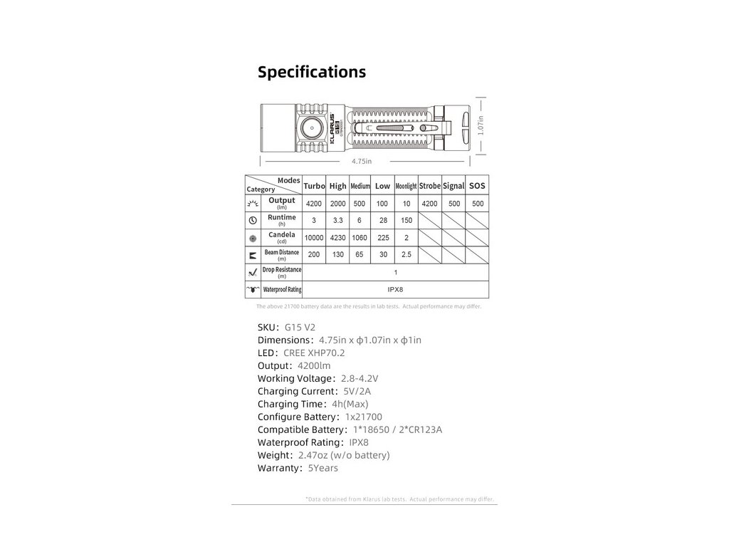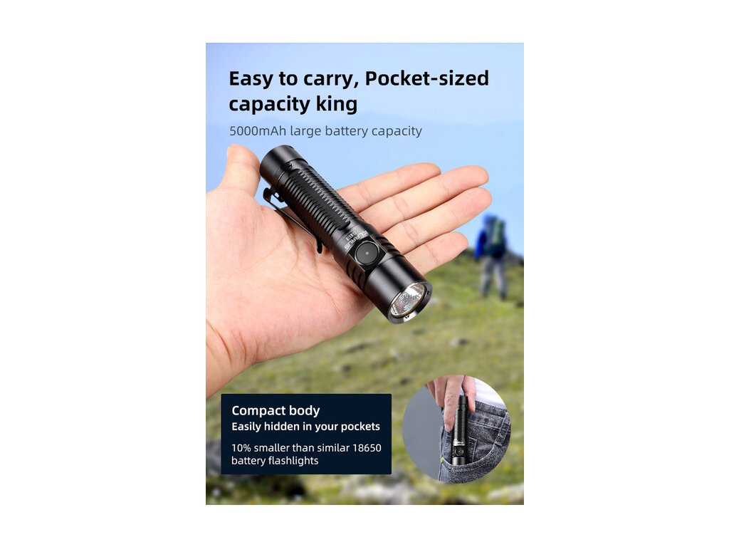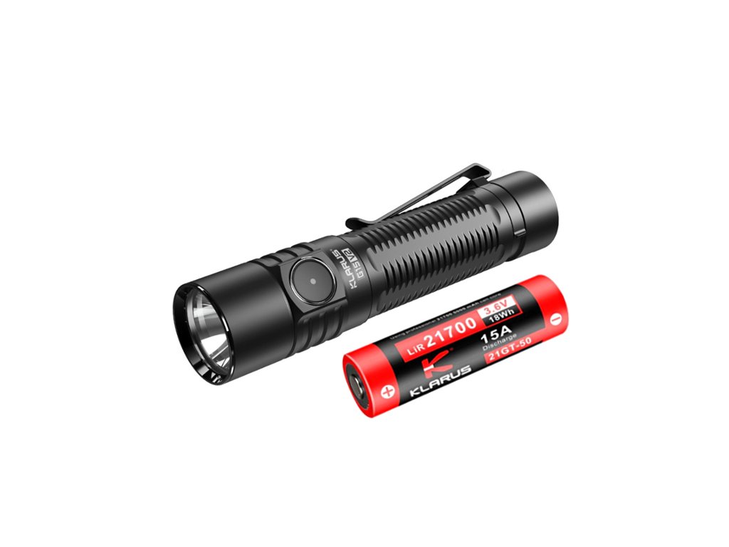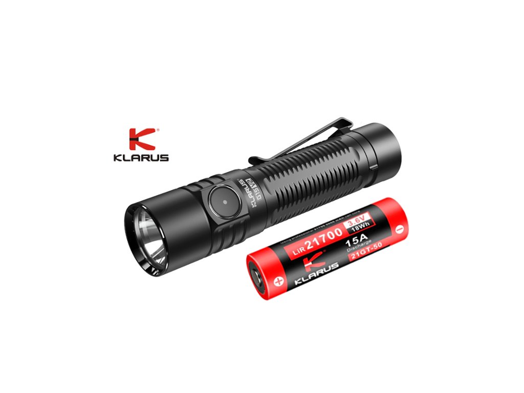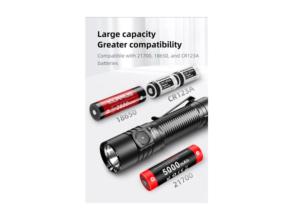 - Vhodné akumulátory/ batérie: 1x Klarus 21700 5000mAh 15A 3,6V, 1x Li-ion 18650 3,6-3,7V/ 2x CR123A 3V