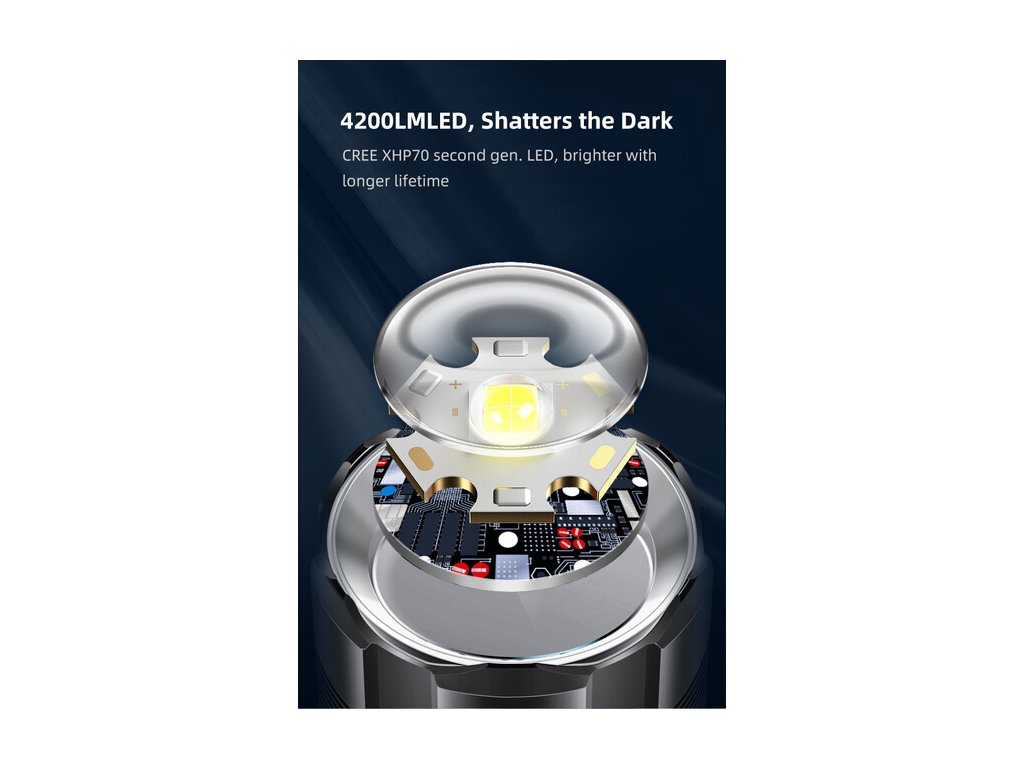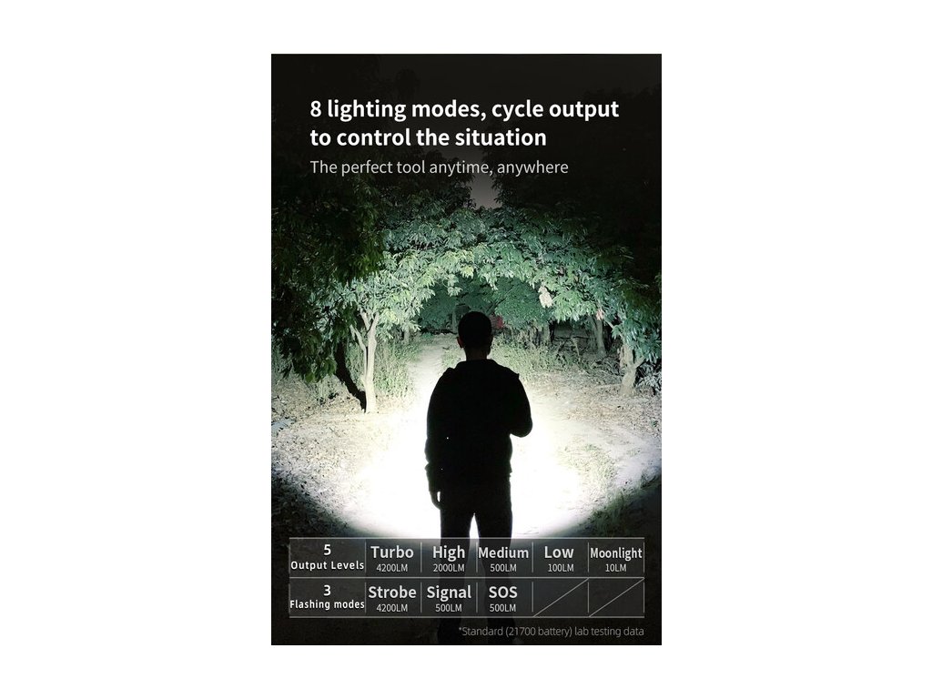 - Doba svietenia: 3hod., ale doba prevádzky je závislá od vnútornej teploty svietidla. Ak vnútorná teplota prekročí 60°C, zasiahne tepelná ochrana ITS a automaticky zníži svetelný výkon. Ak teplota klesne pod spomínanú hranicu, svetlný výkon sa automaticky zvýši (4200lm-TURBO100% výkon), 3,3hod. (2000lm-48% výkon), 6hod. (500lm-12% výkon), 28hod. (100lm-2% výkon), 150hod. (10lm-0,2% výkon), STROBE (4200lm-100% výkon), SIGNAL (500lm-12% výkon), SOS (500lm-12% výkon)