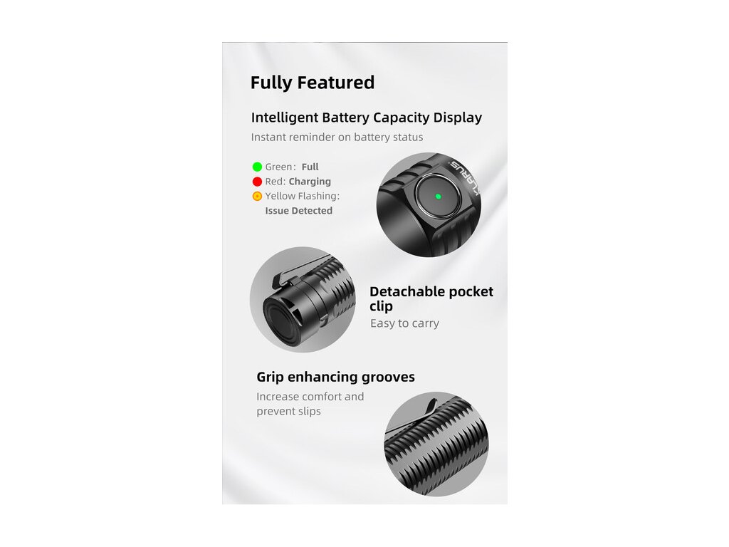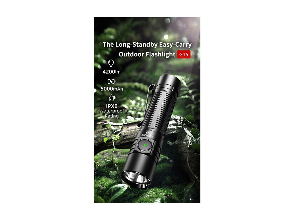 Klarus predstavuje nástupcu populárnej EDC LED ručnej baterky (na každodenné použitie) G15 V2, ktorá poteší nielen svojím extrémnym výkonom 4200lm, ale aj praktickosťou a možnosťou nabíjania Li-ion akumulátora Klarus 21700 5000mAh 15A 3,6V, priamo v tele svietidla, prostredníctvom vynoveného a rýchleho USB-C konektora s nabíjacím/ vybíjacím prúdom až 2A, keďže slúži aj ako záložný zdroj energie Powerbank. Predchádzajúca verzia svietidla túto funkciu nemala. Viete si tak prostredníctvom svietidla, jednoducho dobiť napr. mobil, tablet, atď. Možnosť napájania je aj na 1x 18650 alebo 2x CR123. Plný svetelný výkon TURBO100% 4200lm a najdlhší čas svietenia v jednotlivých režimoch, budú však dosiahnuté len s použitím priloženého Li-ion akumulátorom Klarus 21700 5000mAh 15A 3,6V!!! V have svietidla je osadená moderná, úsporná na energiu a extrémne výkonná CREE XHP70.2 LED v studenom odtieni svetla. Ponúka 5 úrovni jasu svietenia: Turbo100%, 48%, 12%, 2%, 0,2% + 3 zábleskové režimy STROBE100%, SIGNAL12%, SOS12%. TURBO100% režim 4200lm je neuveriteľný svetelný výkon, na tak malé a kompaktné svietidlo!! Vzdialenosť na ktorú Klarus G15 V2 dosvieti je 200m. Klarus v tomto svietidle prináša spoľahlivosť a nekompromisný výkon. Jeden z režimov je aj tzv. ultranízky 0,2%, pre čo najvyššiu výdrž, až 150hod. Napájanie takéhoto extrémneho svetlného výkonu, zabezpečuje 1x Li-ion Klarus 21700 5000mAh 3,6V s vybíjacím prúdom 15A (súčasť balenia). G15 V2 sa zapína/ vypína a ovláda jediným spínačom, umiestneným na hlave svietidla a má v sebe osadenú aj farebnú LED indikaciu, ktorá pri zapnutí svietidla, na 5sek. zobrazí istou farbou, aktuálny stav vybitia akumulátora. Spínač má možnosť uzamknutia svietidla, aby sa nezaplo neúmyselne. Má vodeodolnosť podľa štandardu IPX8 a odolnosť proti nárazu z výšky do 1m. V hlave svietidla je zabudovaný mechanizmus ITS, ktorý reguluje teplotu LED baterky, spôsobom zníženia intenzity svietenia, takže teplota zostane na znesiteľnej úrovni. Má aj ochranu proti opačnému vloženiu akumulátorov (opačná polarita), prebitiu a skratu. Svietidlo má minerálne sklo, ktoré chráni reflektor s LED s ohniskovou vzdialenosťou, ktoré je super jasné a bolo zušľachtené a potiahnuté filmovým AR pokovovaním, ktoré slúži proti poškriabaniu. Reflektor vo vyhotovení OP-pomarančová kôra, má schopnosť dať široký lúč s dostatočne dlhým dosahom svetla. Telo je vyrobená z Type III leteckého tvrdeného hliníka, vojenského štandardu. Dľžka LED ručnej baterky Klarus G15 V2 je iba 12,06cm a váži 144g (s Li-ion akumulátorom 21700) Svietidlo je vhodné pre vyznávačov turistiky, kempovania, dobrodružných ciest, ale je tiež vhodné pre záchranné a pátračské zložky.
