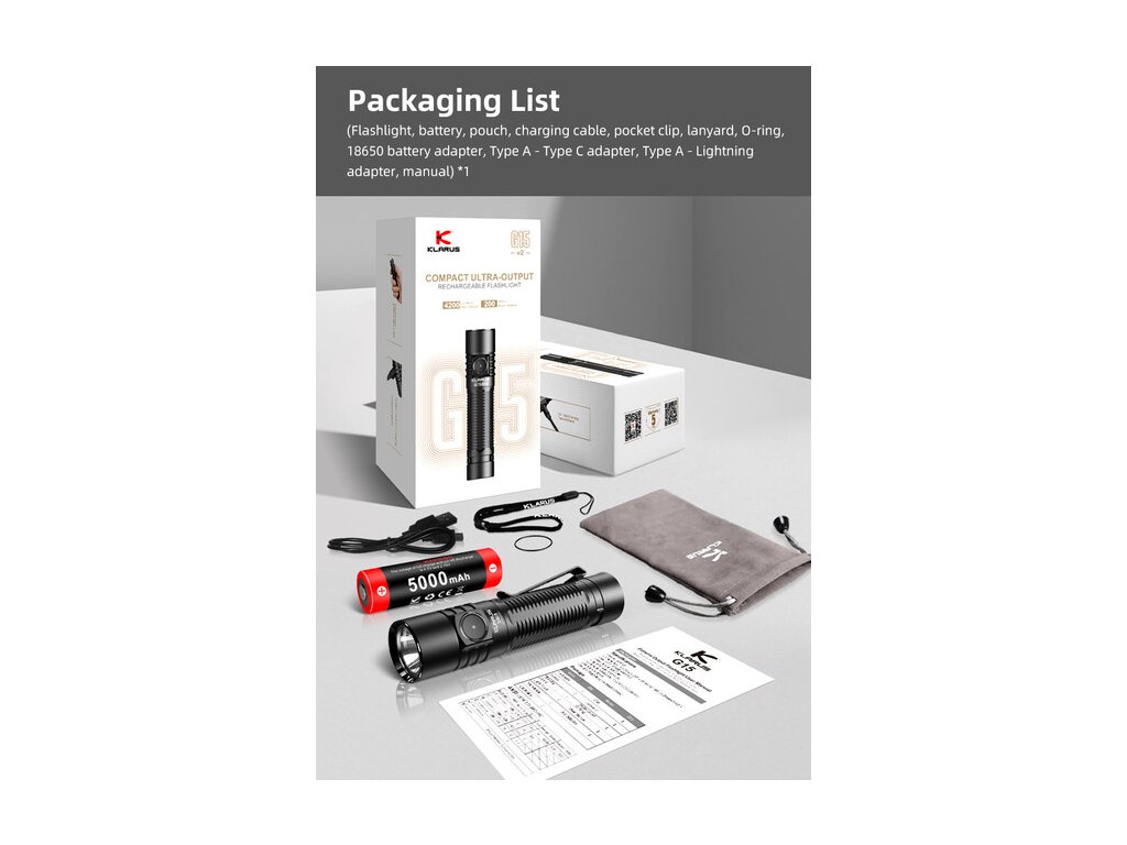 Svietidlo, kovový klip, šnúrka na zápästie, 1x Li-ion Klarus 21700 5000mAh 15A 3,6V akumulátor, 1x náhradný gumený O-krúžok, 1x USB kábel typ C-C, Adaptér na nabíjací kábel C - A, prenosné látkové púzdro. Balenie obsahuje akumulátor/ batériu.