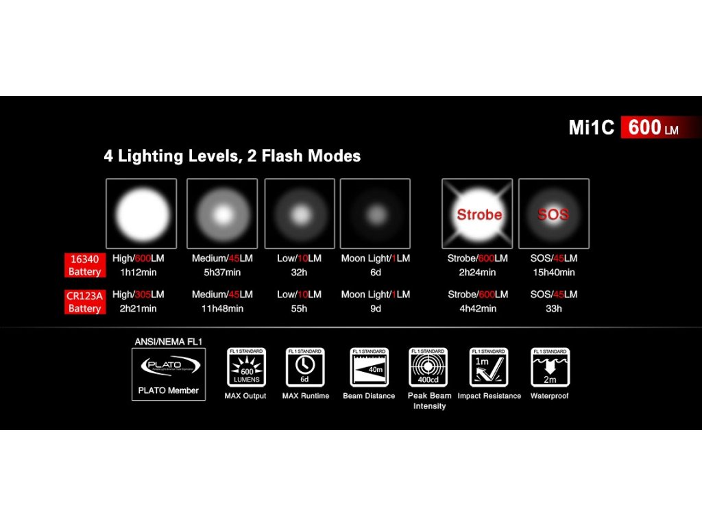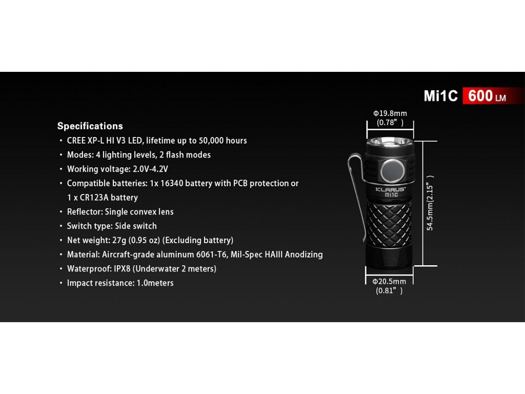 Klarus Mi1C je kombinácia sily a prenosnosti. LED svietidlo Mi1C prináša nový význam termínu "svietidlo pre každodenné použitie". LED baterka nie je väčšia, ako váš palec a je jedno z najkompaktnejších svetelných LED EDC svietidiel. Vďaka svojim miniatúrnym rozmerom, ľahko zapadne do prednej kapsy, alebo sa jednoducho pripevní k opasku, pomocou priloženej spony z nehrdzavejúcej ocele. Kompaktné telo svietidla, pohodlne padne do ruky a je vybavené hlbokým diamantovým rýhovaním, ktoré zaručuje dobrú priľnavosť ruky. Mi1C má dokonca silnú magnetku, umiestnenú v koncovom veku, ktorá dobre poslúži pre upevnenie svietidla na kovové povrchy. Napriek svojej malej veľkosti sa výkonovo zhoduje s intenzitou svojich väčších súperov, čím prináša ohromujúci svetelný tok 600lm. V hlave je osadená výkonná Cree XP-L HI v3 so studeným odtieňom bieleho svetla. Optiku tvorí špeciálna šošovka, pre rozptyl svetla do priestoru a nie do jedného malého bodu. Dosvieti na vzdialenosť 40m. Dostatočne budete mať osvetlenú cestu k vozidlu alebo k dverám domu. Ak je jeho maximálny výkon príliš intenzívny v daný okamih, nemusíte sa obávať; toto všestranné svetlo EDC sa dodáva s množstvom rôznych úrovní jasu, aby vyhovovalo vašim presným požiadavkám na osvetlenie. Poskytuje 4 režimy svietenia 100%, 8%, 2%, 0,2% a 2 zábleskové režimy STROBE, SOS. Sú ľahko dostupné, pomocou bočného spínača. Klarus Mi1C dokonca dobre poslúži aj v núdzových situáciách - režim Strobe pre oslepovanie útočníka a S.O.S pre signalizáciu pomoci. Pokiaľ ide o každodenné nosenie svetidla, pohodlie je kľúčová vlastnosť. Súčasťou balenia je aj micro-USB nabíjaci akumulátor Li-ion 16340 s kapacitou 700mAh 3,6V. Aby bola zaistená jeho najvyššia využiteľnosť, akumulátor dokáže poskytnúť svietidlu, až 6 dňí prevádzky! Li-ion akumulátor 16340 sa dobíjaná prostredníctvom praktického nabíjacieho portu micro-USB, ktorý je umiestený v samotnom akumulátore. Aby akumulátor Li-ion 16340 mal stále dostatok energie, môžete skontrolovať jeho zvyšnú kapacitu, kliknutím na bočný spínač, keď je svietidlo vypnuté. Spôsobí to, že LED bude blikať, čo indikuje zostávajúcu kapacitu. Pokiaľ hladáte malé, praktické svietidlo s micro-USB akumulátorom v balení, je Klarus Mi1C tou správnou voľbou.