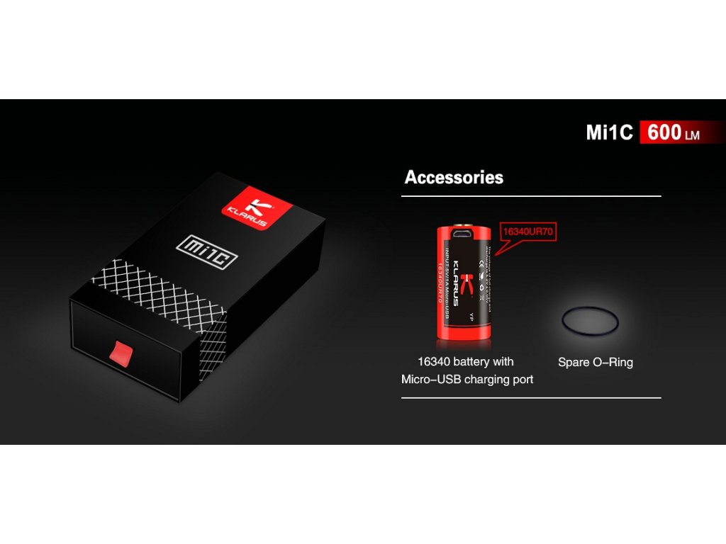 Svietidlo, 2x náhradný O-krúžok, 1x kovový klip, 1x Micro USB Li-ion Klarus 16340 700mAh 3,6V. Balenie obsahuje akumulátor/ batériu.
