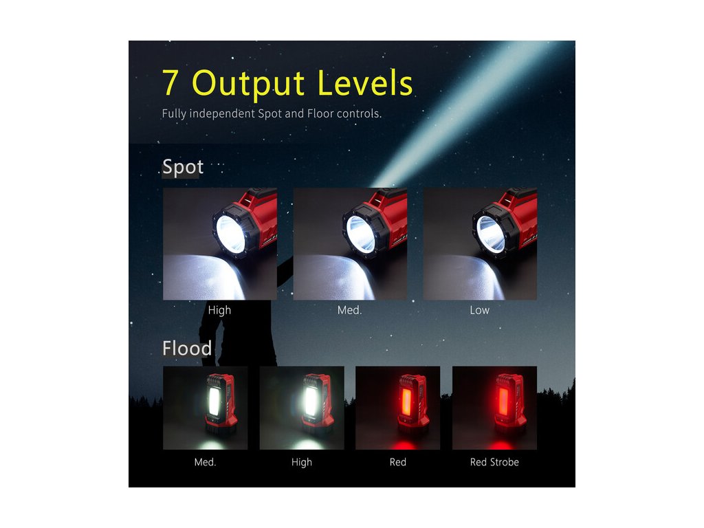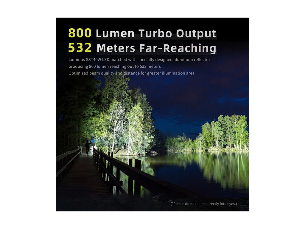 - Doba svietenia: Predná CW LED, ponúka 3 režimy svietenia: Turbo 100%-66% (800lm 8min., potom automat. prepne na nižší režim výkonu 530lm 7,4hod), 50% (400lm-11hod.), 20% (160lm-28hod.)// Bočná COB DW LED 2 režimy svietenia: 40% (200lm-16hod.) a 100% svietenie (500lm-6,5hod.)// Červené bočné SMD LED, ponúkajú 1 režim svietenia: 100% červené svietenie (25lm-31hod.)