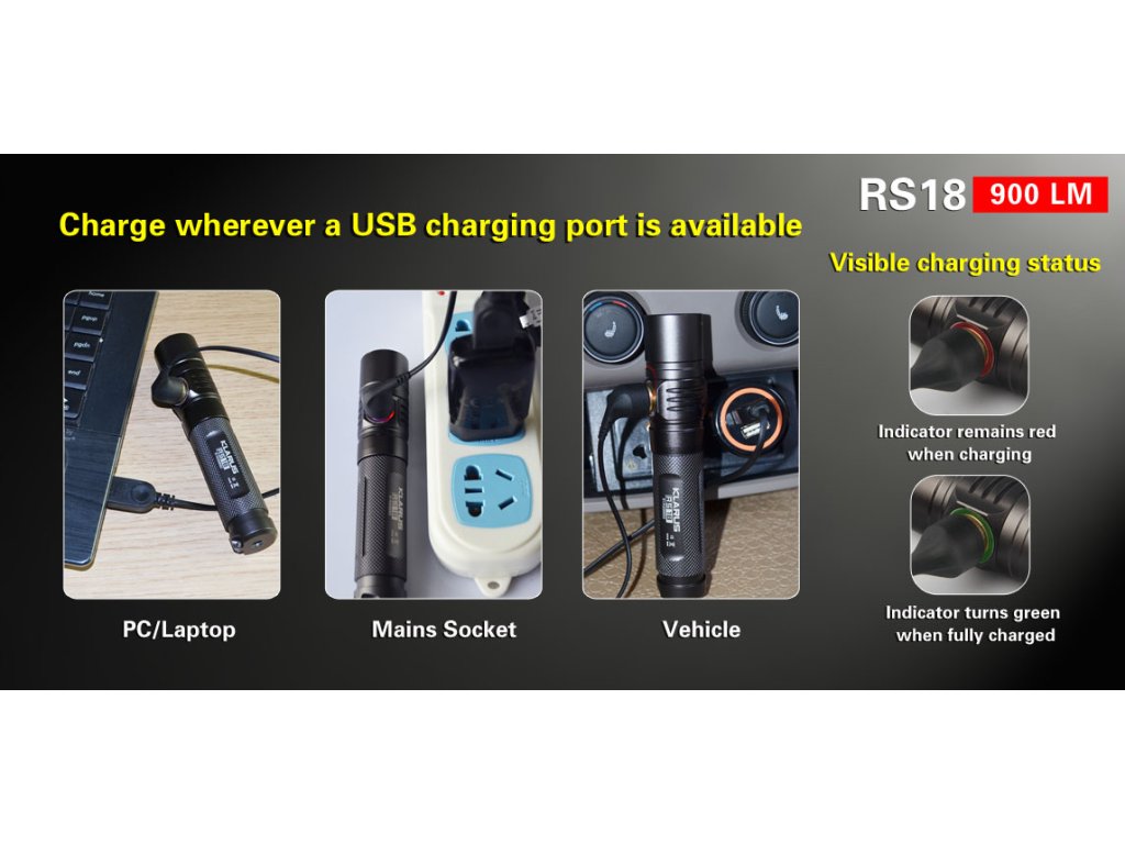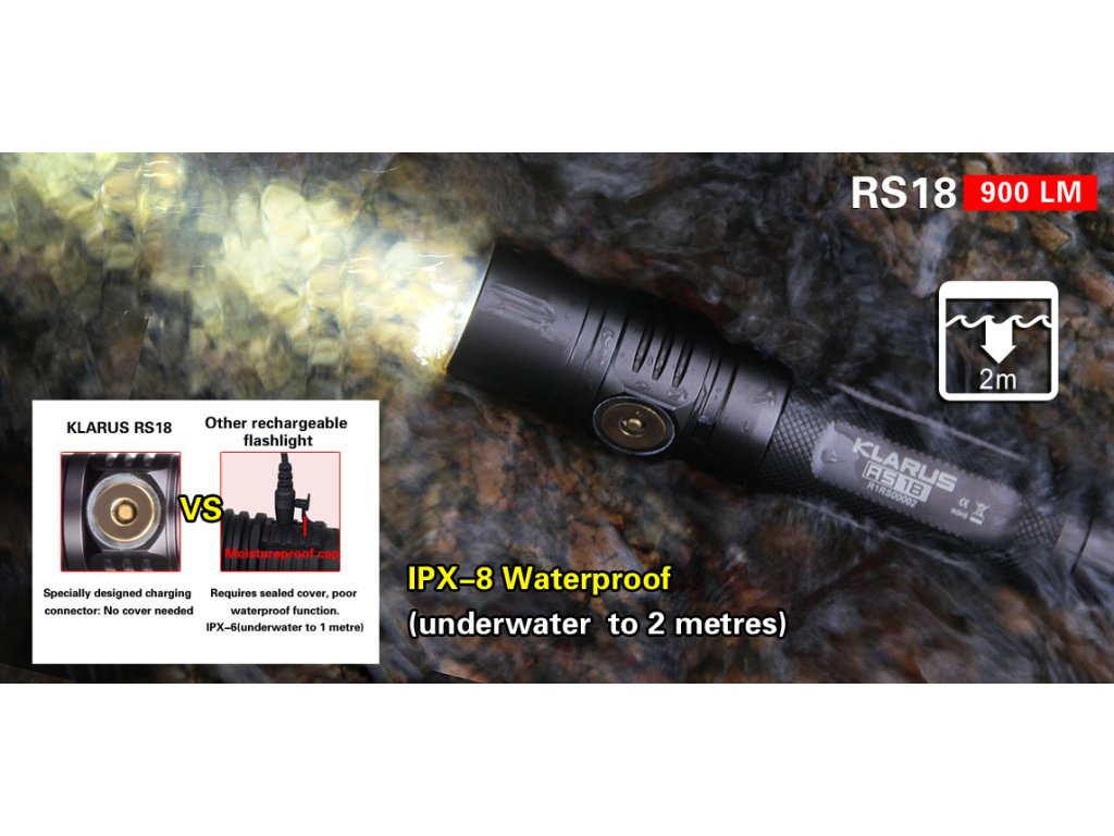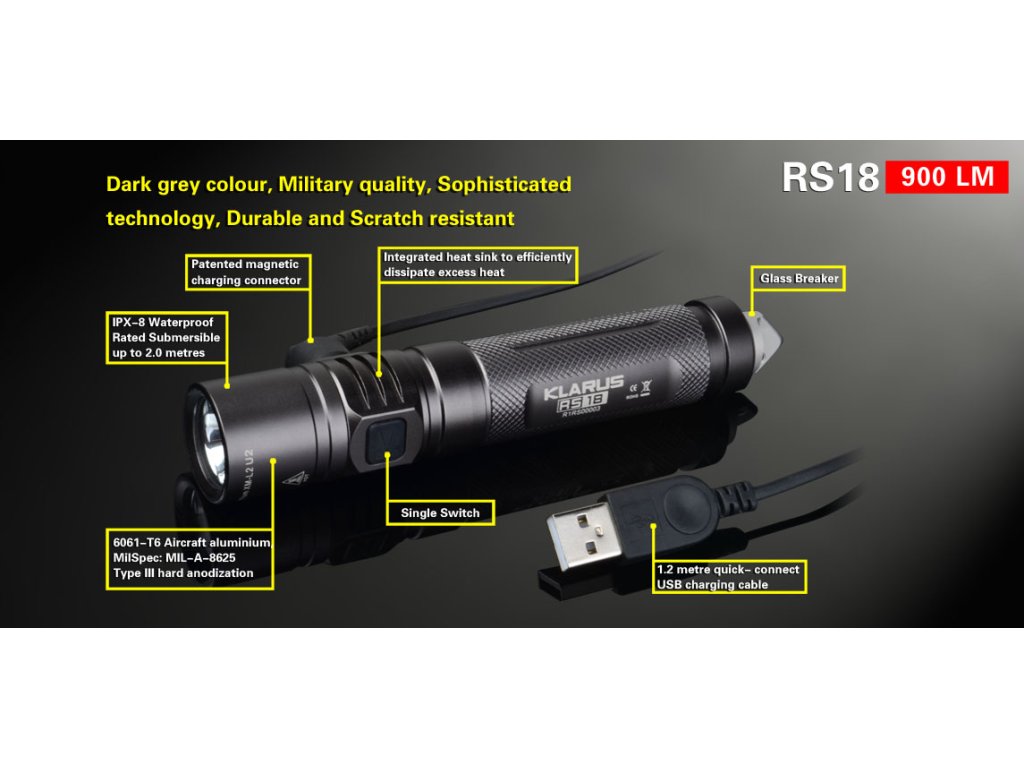 Klarus RS18 je vynikajúca USB dobíjacia LED baterka na každodenné nosenie a univerzálne použitie. Toto svietidlo sa vyznačuje tým, že na jeho konci je umiestnený odnímatelný kovový hrot, ktorý sa hodí napr. pri krízových situáciách, kedy treba rozbiť sklo v aute, na sebaobranu, atď. Ponúka 4 režimov svietenia: 100%, 23%, 1%, 0,1% a 2 zábleskové režimy: STROBE, SOS. Akumulátor je možné nabíjať priamo v tele svietidla cez ľubovoľný port USB, vďaka špeciálnemu a jedinečnému magnetickému konektoru na nabíjacom USB kábli. Nabíjanie je tak jednoduché a elegantné. Magnetický port slúži aj ako magnet pre uchytenie kovových predmetov na svietidlo. Svietidlo je dodávané s nabíjacím Li-ion akumulátorom Klarus 18650 2600mAh 3,7V. Dížka svietidla je niečo cez 13 cm. V hlave svietidla je osadená moderná Cree XM-L2 U2 LED, ktorá dodáva maximálne až 900 ANSI lumenov. Na svoju malú a kompaktnú veľkosť, poskytuje dostatočne veľké množstvo svetla. Hlboký reflektor usmerní hladký lúč svetla a vzdialenosť na ktorú dosvieti je až 165m. Užívateľské rozhranie je veľmi intuitívne a všetky svetelné režimy sú ovládané pomocou jediného tlačidla. Svietidlo Klarus RS18 je ideálnym univerzálnym svietidlom pre kempovanie, cestovanie a každodenné použitie EDC.
