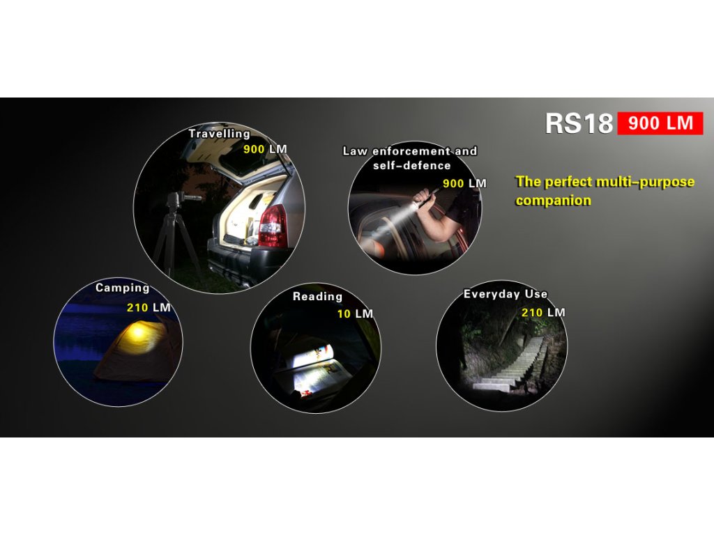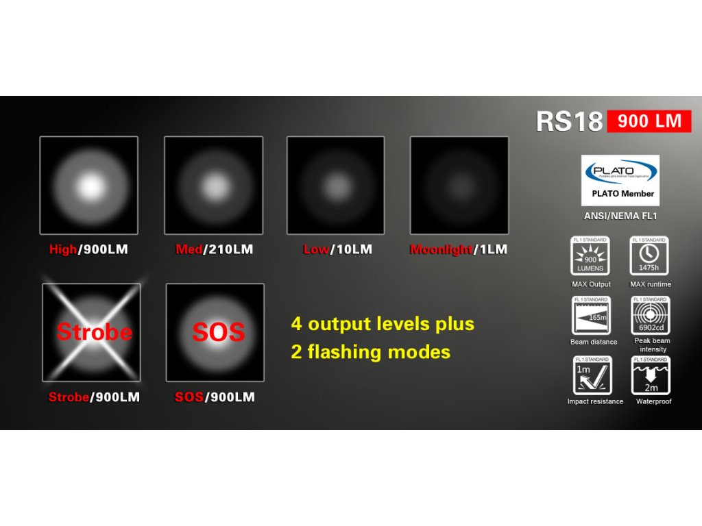 - Doba svietenia: 2,8hod. (900lm-100% výkon), 10hod. (210lm-23% výkon), 178hod. (10lm-1% výkon), 1457hod. (1lm-0,1% výkon), STROBE (900lm-100% výkon), SOS (900lm-100% výkon)