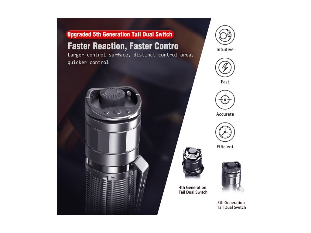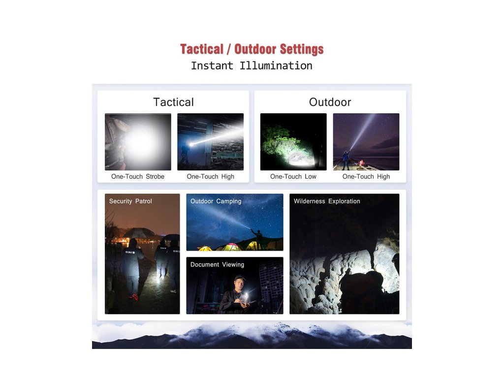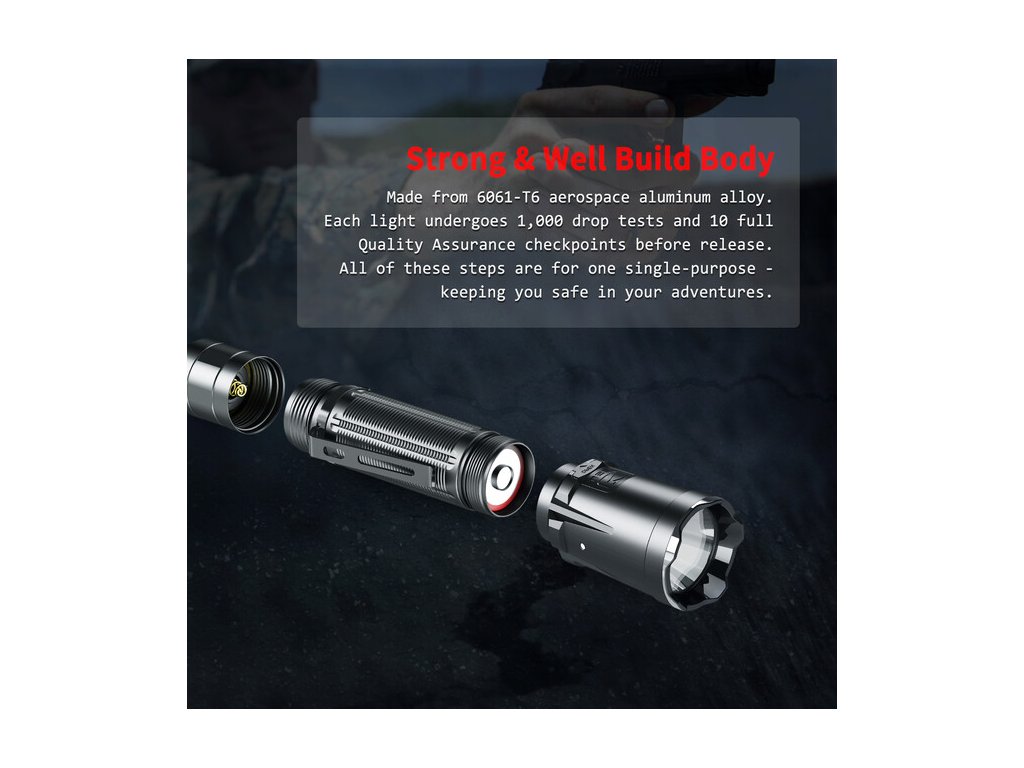 Zmena módu Taktický a Outdoorový - Podržte podlhovastý režimový spínač cca 10sec. Kontrolná indikačná LED z boku svietidla, začne preblikávať na zeleno a červeno. Držte stále stlačený režimový spínač a v tom stlačte okrúhly spínač, čím prepnete medzi režimami - Taktický a Outdoor. Taktické nastavenie, vám umožňuje rýchly prístup k Turbo 100% režimu a pozdĺžnym spínačom navolíte zábleskový režim STROBE. Outdoorové nastavenie, umožňuje rýchly prístup k Turbo 100% režimu a Ultranízkemu 0,16% režimu svietenia. Pre vrátenie sa k predošlému módu, postup opakujte.