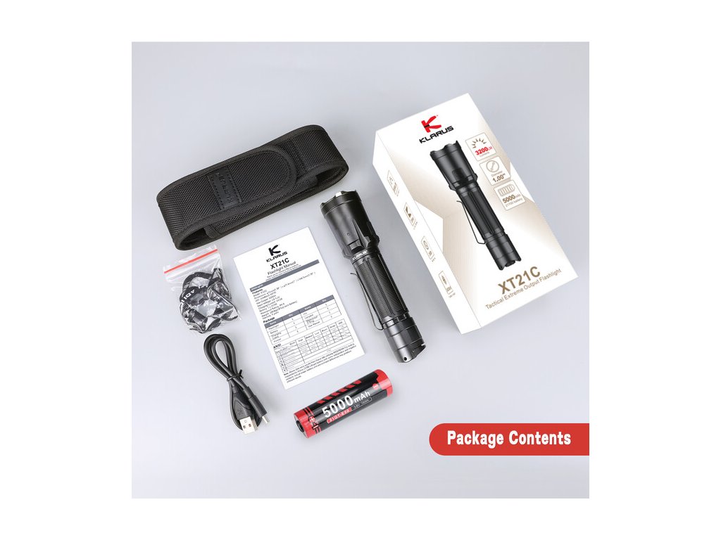 Svietidlo, nylonové púzdro na opasok, šnúrka na zápästie, 1x náhradný tesniaci O-krúžok, klip na opasok, 1x špeciálny Li-ion akumulátor Klarus 21GT-E50 21700 5000mAh 3,6V, nabíjací USB-C kábel. Balenie obsahuje akumulátor/ batériu.