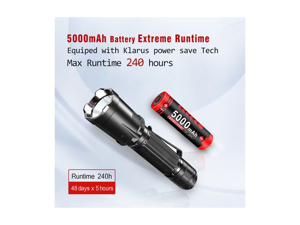 - Vhodné akumulátory/ batérie: 1x špeciálny typ 21700 akumulátora Klarus 21GT-E50 5000mAh 3,6V