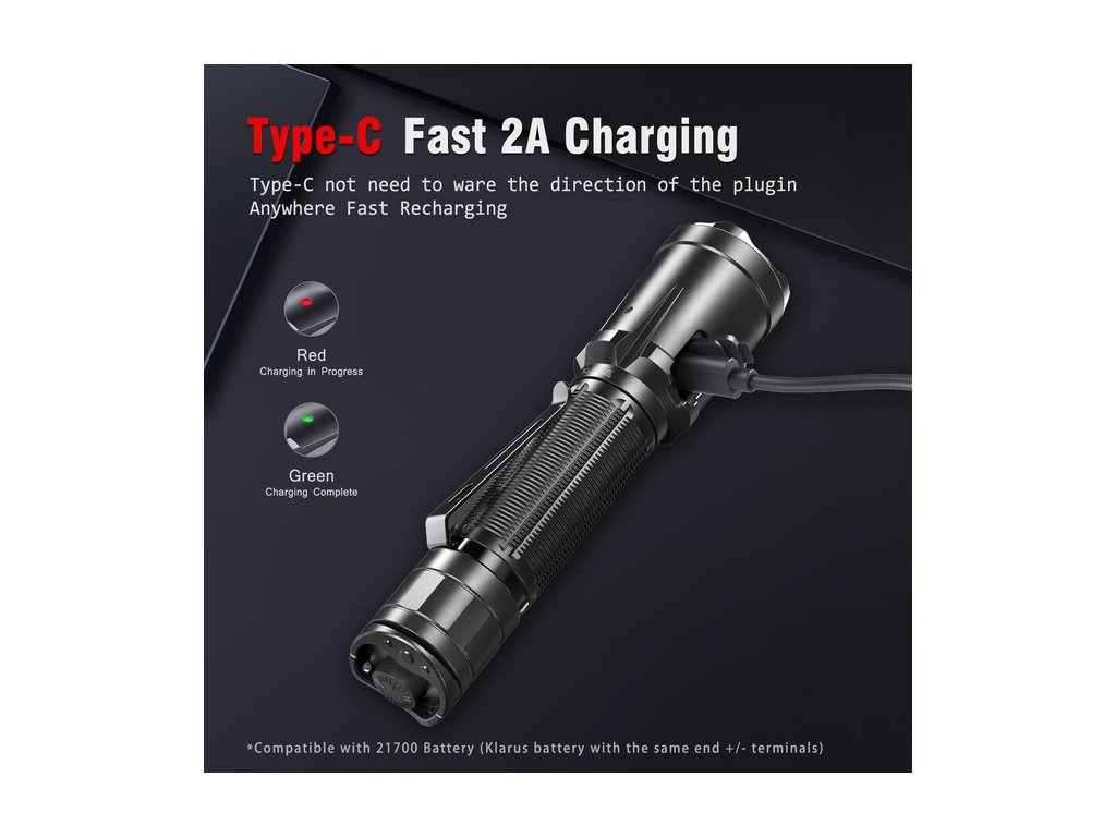 Pripojte priložený USB-C kábel do konektora, ktorý je ukrytý pod gumenou krytkou na hlave svietidla, ktorú treba jemne odklopiť. Druhý koniec pripojte napr. do USB portu PC, adaptéra do el. siete od mobilného telefónu. Pre nabíjanie využíva štandardný USB port, takže môžete akumulátor nabíjať doma, v kancelárii, vo vozidle alebo kdekoľvek, kde máte k dispozícii USB port. Špeciálny 1x Li-ion akumulátor Klarus 21700 3,6V, umiestnený v tele svietidla sa začne nabíjať. Nabíjanie je signalizované svietením indikačnej LED, umiestnenej v hlave svietidla z bočnej strany. Počas nabíjania svieti na červeno, keď je Li-ion akumulátor plne nabitý, začne svietiť na zeleno. Po dokončení nabíjania, odpojte USB-C kábel.