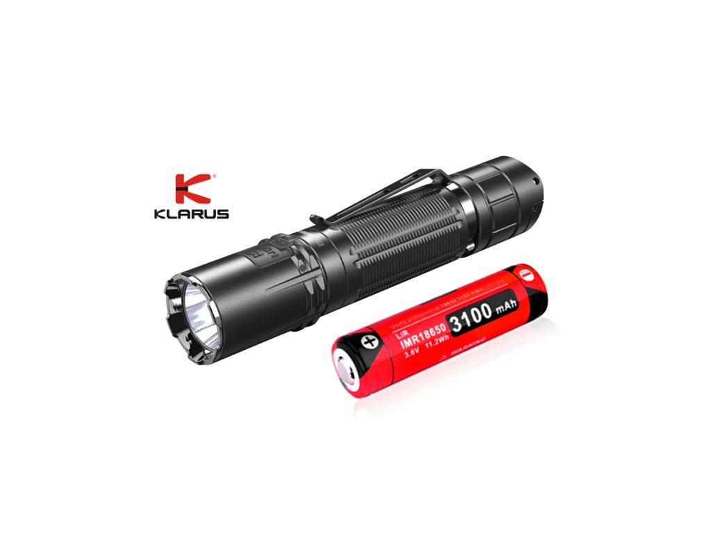 Svietidlo, púzdro na opasok, šnúrka na zápästie, kovový klip na opasok, 1x Li-ion akumulátor Klarus IMR 18650 3100mAh 3,6V, nabíjací USB-C kábel, 1x náhradný tesniaci O-krúžok. Balenie obsahuje akumulátor/ batériu.