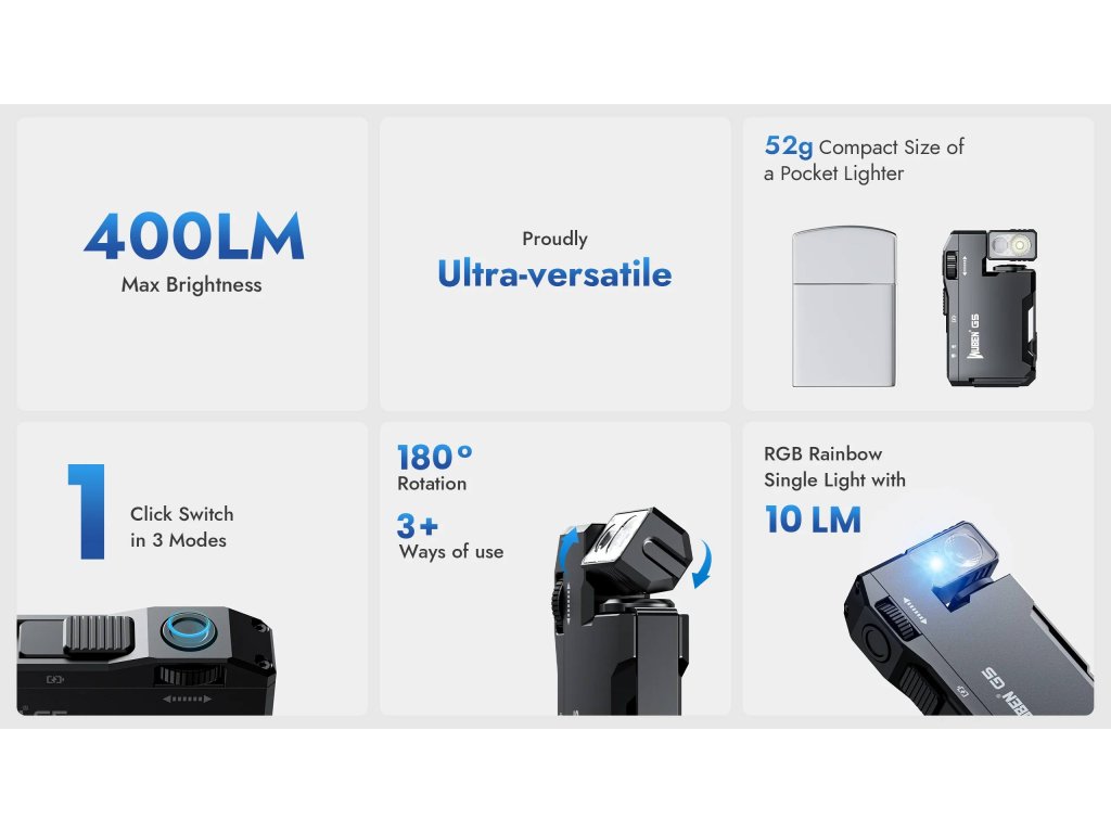 WUBEN G5 EDC je výnimočne univerzálna, vysokokvalitná LED baterka, navrhnutá tak, aby spájala maximálnu funkčnosť s extrémne kompaktným a robustným dizajnom. Dodáva sa v minimalistickom tvare, veľkosti ako Zippo zapaľovač — takže sa ľahko zmestí do vrecka, batohu, či kľúčov bez toho, aby ťa zaťažovala.